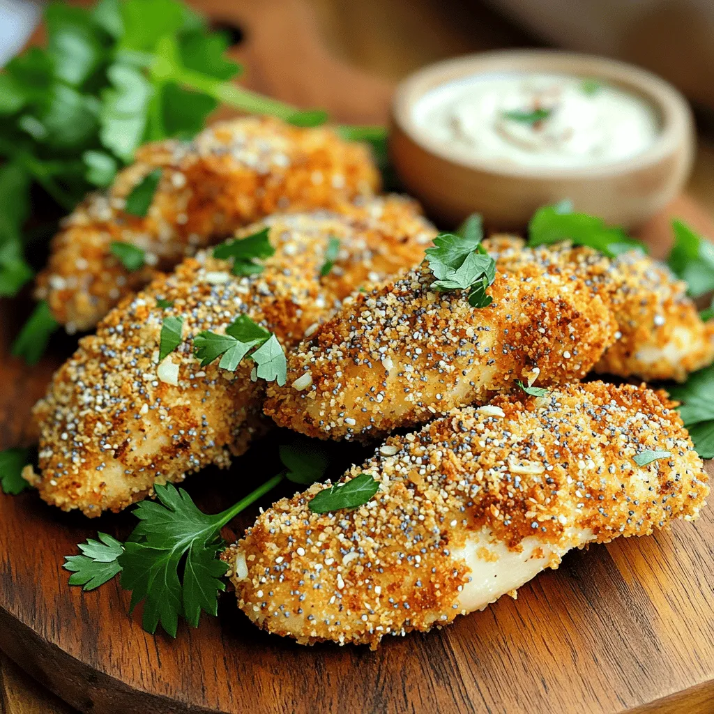 Hähnchenstreifen sind die Hauptzutat. Sie geben den zarten Biss. Buttermilch macht das Hähnchen saftig. Sie hilft, das Fleisch zu marinieren. Allzweckmehl sorgt für die erste Schicht. Es hilft dabei, die Beschichtung zu halten. Das Ei wirkt als Kleber für die Semmelbrösel. Diese machen das Ganze knusprig. Panko ist ideal, um zusätzlichen Crunch zu geben. Everything Bagel Gewürzmischung bringt tollen Geschmack. Knoblauch- und Zwiebelpulver fügen Tiefe hinzu. Salz und Pfeffer bringen alles zusammen. Sprühöl sorgt dafür, dass die Hähnchenstreifen schön braun werden.