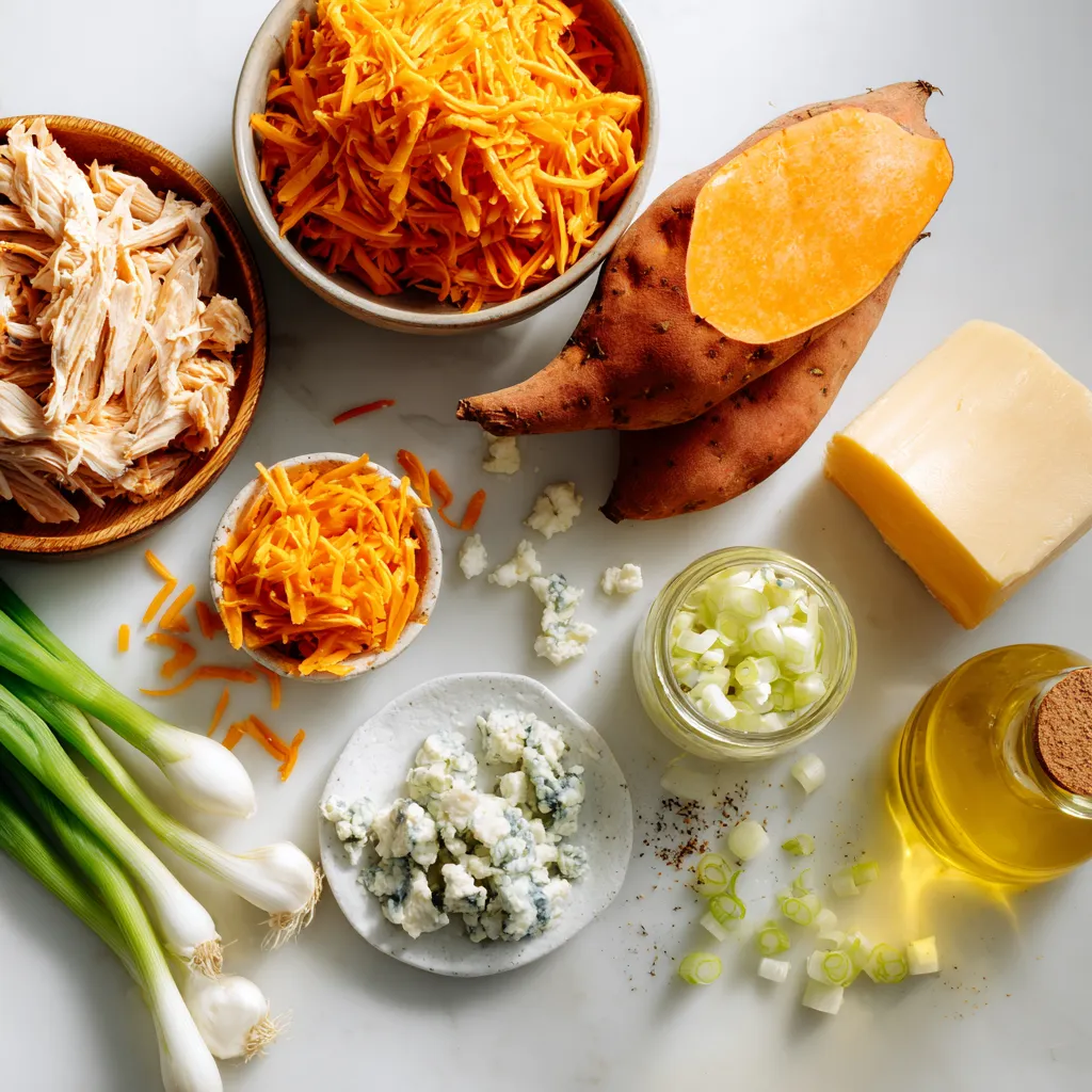 - 2 mittelgroße Süßkartoffeln - 1 Tasse gekochtes, zerkleinertes Hähnchen - 1/2 Tasse Buffalo-Sauce - 1/4 Tasse Frischkäse, weich - 1/2 Tasse geriebener Cheddarkäse - 2 Frühlingszwiebeln, in Ringe - 1/4 Tasse Blauschimmelkäse (optional) - Olivenöl - Salz und Pfeffer Wählen Sie frische Süßkartoffeln. Sie sollten fest sein und keine Flecken haben. Gekochtes Hähnchen kann von einem Brathähnchen stammen oder selbst gekocht werden. Die Buffalo-Sauce entscheidet über die Schärfe. Wählen Sie eine, die Ihnen schmeckt. Käse kann variieren. Cheddar bringt einen tollen Geschmack, während Blauschimmelkäse eine kräftige Note hinzufügt. Achten Sie auf das Gewicht der Süßkartoffeln. Sie sollten sich schwer anfühlen. Lagern Sie sie kühl und trocken. Vermeiden Sie Sonnenlicht. So bleiben sie länger frisch. Wenn Sie sie schälen, verwenden Sie ein scharfes Messer. Das macht die Arbeit einfacher. Prüfen Sie nach dem Kochen die Zartheit mit einer Gabel. Wenn sie leicht durchgeht, sind sie perfekt! {{ingredient_image_2}} Heize deinen Ofen auf 200°C vor. Das ist wichtig, damit die Süßkartoffeln gleichmäßig garen. Reinige die Süßkartoffeln gut unter fließendem Wasser. Steche sie dann mit einer Gabel mehrmals ein. Das hilft, den Dampf zu entweichen. Reibe etwas Olivenöl auf die Haut und streue eine Prise Salz darüber. Das wird den Geschmack verbessern. Lege die Süßkartoffeln auf ein Backblech. Backe sie für etwa 45 bis 50 Minuten, bis sie innen zart sind. Während die Süßkartoffeln backen, kannst du die Hähnchenfüllung machen. Nimm eine große Schüssel und füge das zerkleinerte Hähnchen hinzu. Gieße die Buffalo-Sauce darüber. Du kannst die Menge anpassen, je nachdem, wie scharf du es magst. Füge dann den weichen Frischkäse hinzu. Rühre alles gut um, bis es cremig ist. Diese Mischung ist der Schlüssel zum Geschmack. Wenn die Süßkartoffeln fertig sind, lass sie kurz abkühlen. Schneide sie der Länge nach auf. Schöpfe vorsichtig etwas Fruchtfleisch aus, damit Platz für die Füllung ist. Achte darauf, nicht zu tief zu schöpfen! Mische das ausgekratzte Süßkartoffelfleisch mit der Hähnchenmischung. Füge den geriebenen Cheddarkäse hinzu und vermenge alles gut. Fülle jede Süßkartoffelhälfte mit der Mischung. Wenn du magst, streue etwas extra Käse oben drauf. Stelle die gefüllten Süßkartoffeln zurück in den Ofen und backe sie weitere 10 bis 15 Minuten. Der Käse sollte geschmolzen und sprudelnd sein. Garnier die Süßkartoffeln mit Frühlingszwiebeln, Blauschimmelkäse und frischem Koriander. Das sieht nicht nur gut aus, sondern schmeckt auch toll. Um die besten Süßkartoffeln zu bekommen, backe ich sie bei 200°C. Ich wasche sie gründlich und steche sie mit einer Gabel ein. Dadurch kann die Feuchtigkeit entweichen. Ich reibe sie leicht mit Olivenöl ein und streue etwas Salz darüber. So werden sie außen schön knusprig und innen weich. Backe sie für etwa 45-50 Minuten. Du weißt, dass sie fertig sind, wenn du leicht mit einer Gabel hineinstechen kannst. Um die Füllung cremiger zu machen, füge mehr Frischkäse hinzu. Ich mag es, etwa 1/3 Tasse Frischkäse zu verwenden. Der Frischkäse macht die Mischung weich und lecker. Du kannst auch griechischen Joghurt für einen gesunden Twist verwenden. Wenn du es noch geschmackvoller magst, mische etwas geriebenen Cheddarkäse unter die Füllung. Das gibt einen tollen Käsegeschmack und eine tolle Textur. Ich serviere die gefüllten Süßkartoffeln gerne mit zusätzlichen Zutaten. Ein Spritzer Buffalo-Sauce oben drauf macht sie noch würziger. Frische Frühlingszwiebeln geben einen schönen Crunch. Blauschimmelkäse ist ein weiterer Leckerbissen, den ich gerne hinzufüge. Er bringt einen salzigen Geschmack. Frischer Koriander sorgt für Farbe und Frische. Diese Extras machen dein Gericht bunter und schmackhafter. Pro Tipps Süßkartoffeln richtig backen: Um sicherzustellen, dass die Süßkartoffeln perfekt weich sind, stechen Sie sie vor dem Backen mehrmals mit einer Gabel ein. Dies hilft, den Dampf entweichen zu lassen und ein gleichmäßiges Garen zu gewährleisten. Variieren Sie die Schärfe: Passen Sie die Menge der Buffalo-Sauce nach Ihrem persönlichen Geschmack an. Sie können auch verschiedene Sorten verwenden, um verschiedene Geschmacksrichtungen zu erzielen. Frischkäse gleichmäßig einarbeiten: Stellen Sie sicher, dass der Frischkäse weich und zimmerwarm ist, bevor Sie ihn zur Hähnchenmischung hinzufügen. So lässt er sich besser und gleichmäßiger einarbeiten. Extra Käse für den Geschmack: Fügen Sie zusätzlich etwas Cheddarkäse oben auf die gefüllten Süßkartoffeln hinzu, bevor Sie sie erneut backen. Dies sorgt für eine köstlich geschmolzene Käsekruste. {{image_4}} Für eine vegetarische oder vegane Variante können Sie die Hähnchenfüllung ersetzen. Nutzen Sie stattdessen geröstete Kichererbsen oder gewürfelten Tofu. Marinieren Sie den Tofu mit Buffalo-Sauce für den gleichen würzigen Geschmack. Fügen Sie Cremigkeit hinzu, indem Sie pflanzlichen Frischkäse verwenden. Auch Avocado oder schwarze Bohnen passen gut. Die Schärfe ist oft entscheidend. Wenn Sie es milder mögen, reduzieren Sie die Buffalo-Sauce. Mischen Sie etwas Honig oder Ahornsirup unter, um die Schärfe auszugleichen. Für mehr Schärfe können Sie zusätzliche Chili-Flocken oder scharfen Käse hinzufügen. Experimentieren Sie mit Gewürzen wie Paprika oder Knoblauchpulver für verschiedene Geschmäcker. Um das Gericht abzurunden, bieten sich frische Salate an. Ein einfacher grüner Salat mit Vinaigrette passt gut. Auch eine cremige Coleslaw kann eine schöne Ergänzung sein. Für etwas mehr Fülle können Sie Reis oder Quinoa servieren. Diese Beilagen bieten Farbe und verschiedene Texturen, die das Essen auflockern. Wenn du gefüllte Süßkartoffeln übrig hast, bewahre sie richtig auf. Lass sie zuerst auf Raumtemperatur abkühlen. Lege sie dann in einen luftdichten Behälter. So bleiben sie frisch. D