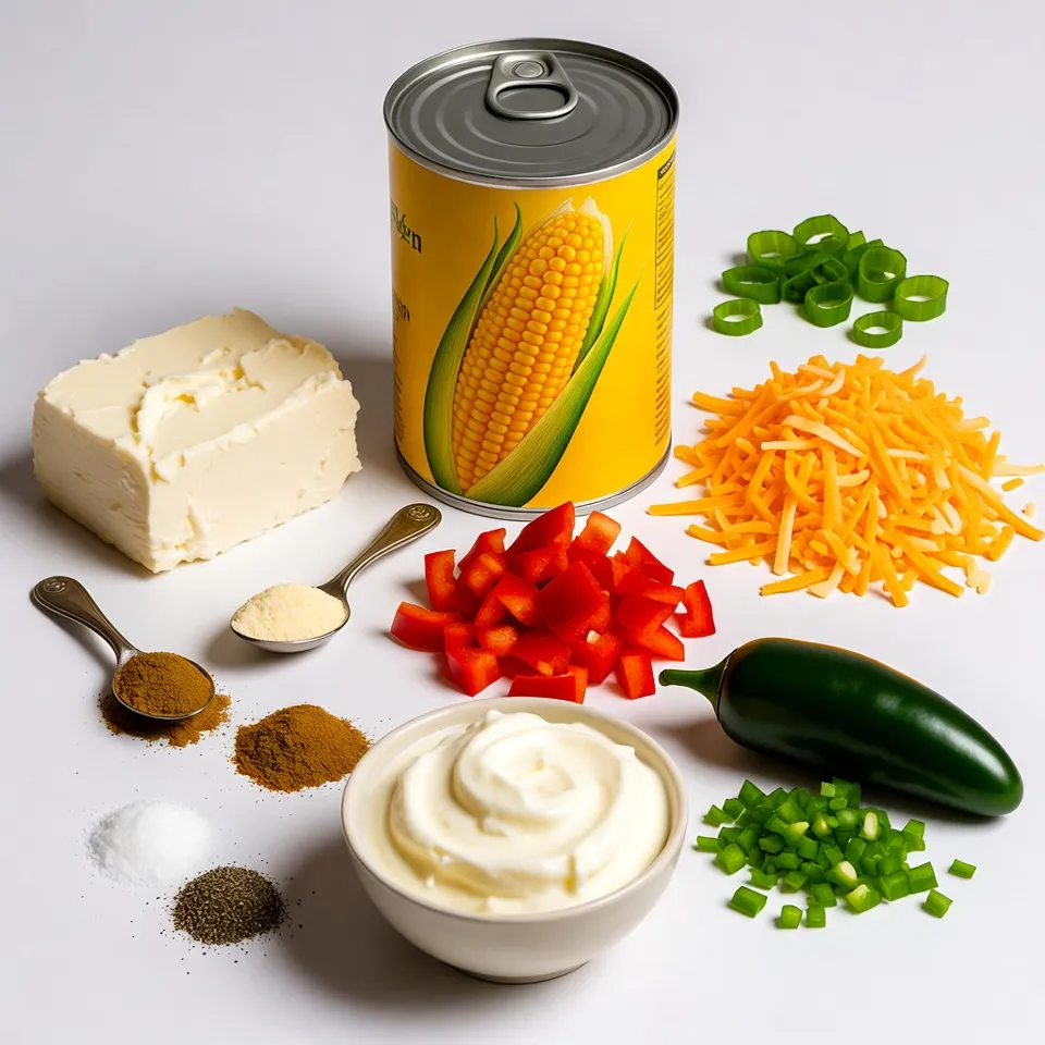 Um diesen Dip zuzubereiten, starten wir mit den Zutaten. Nehmen Sie eine Dose süßen Mais. Lassen Sie den Mais gut abtropfen. Nehmen Sie auch Frischkäse, Cheddar-Käse und Sauerrahm. Diese drei Zutaten machen den Dip schön cremig. Hacken Sie zwei Jalapeños und entfernen Sie die Kerne. Wenn Sie weniger Schärfe wollen, ist das wichtig. Würfeln Sie eine rote Paprika und schneiden Sie einige Frühlingszwiebeln in Ringe. Vergessen Sie nicht, Knoblauchpulver und Kreuzkümmel bereit zu halten.