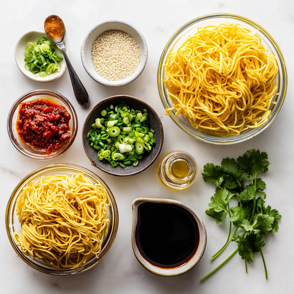 Für die Chili Garlic Noodles brauche ich frische, einfache Zutaten. Hier sind die Hauptbestandteile: