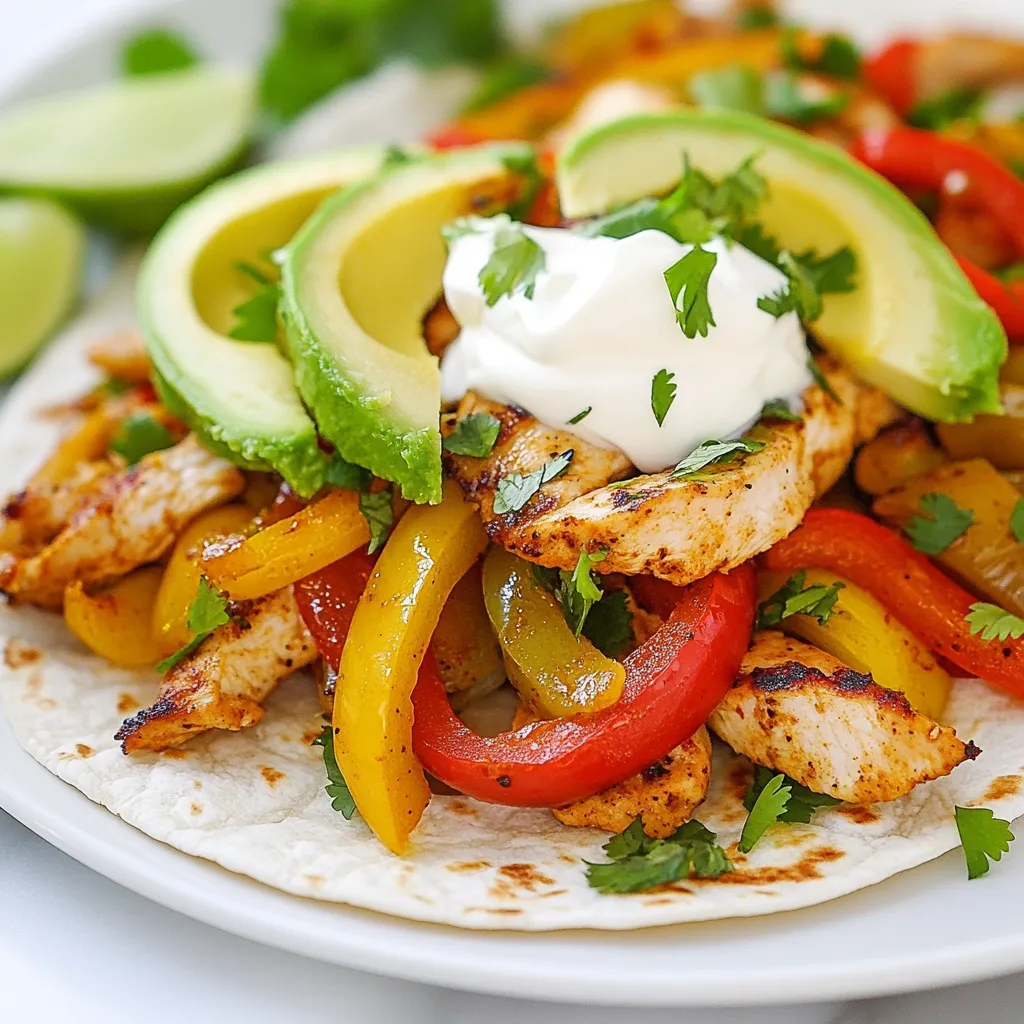 • Zum Servieren eine großzügige Portion der Hähnchen-Gemüse-Mischung auf jede Tortilla geben. Mit frischen Avocadoscheiben, einem Klecks Sauerrahm und einer Prise Koriander garnieren.