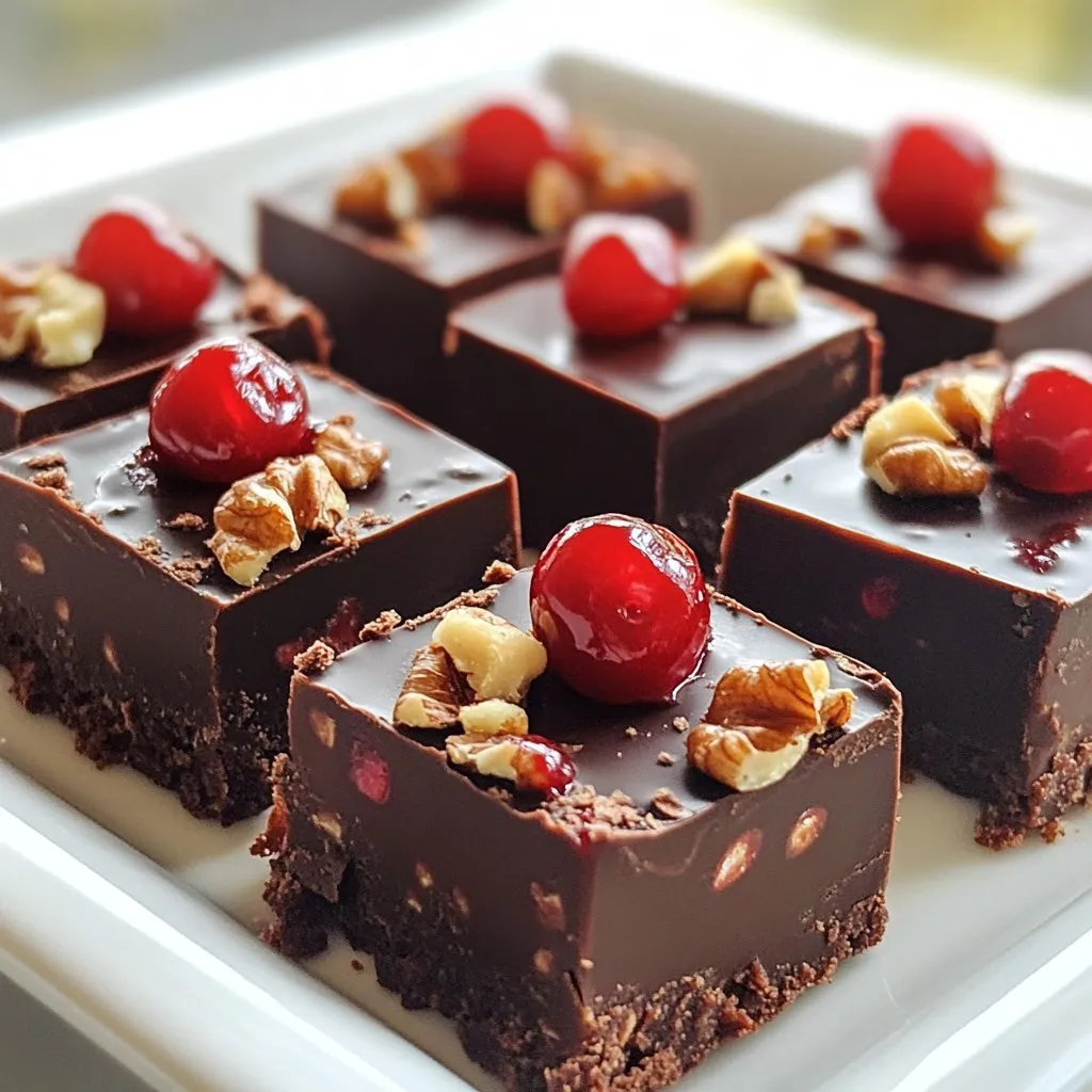 Für eine ansprechende Präsentation servieren Sie die Fudge-Quadrate auf einem dekorativen Teller, garniert mit ein paar ganzen Kirschen und einer Prise Kakaopulver.