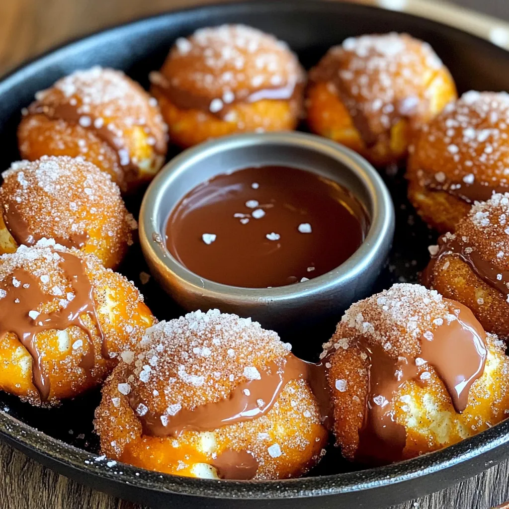 Nimm die Bissen aus der Pfanne und bestreue sie sofort mit grobem Meersalz. Das Salz bringt den süßen Geschmack perfekt zur Geltung. Serviere sie warm in einer großen Pfanne oder einer hübschen Schüssel. Du kannst auch eine kleine Schale mit geschmolzener Schokolade oder Frischkäse-Dip dazu stellen.