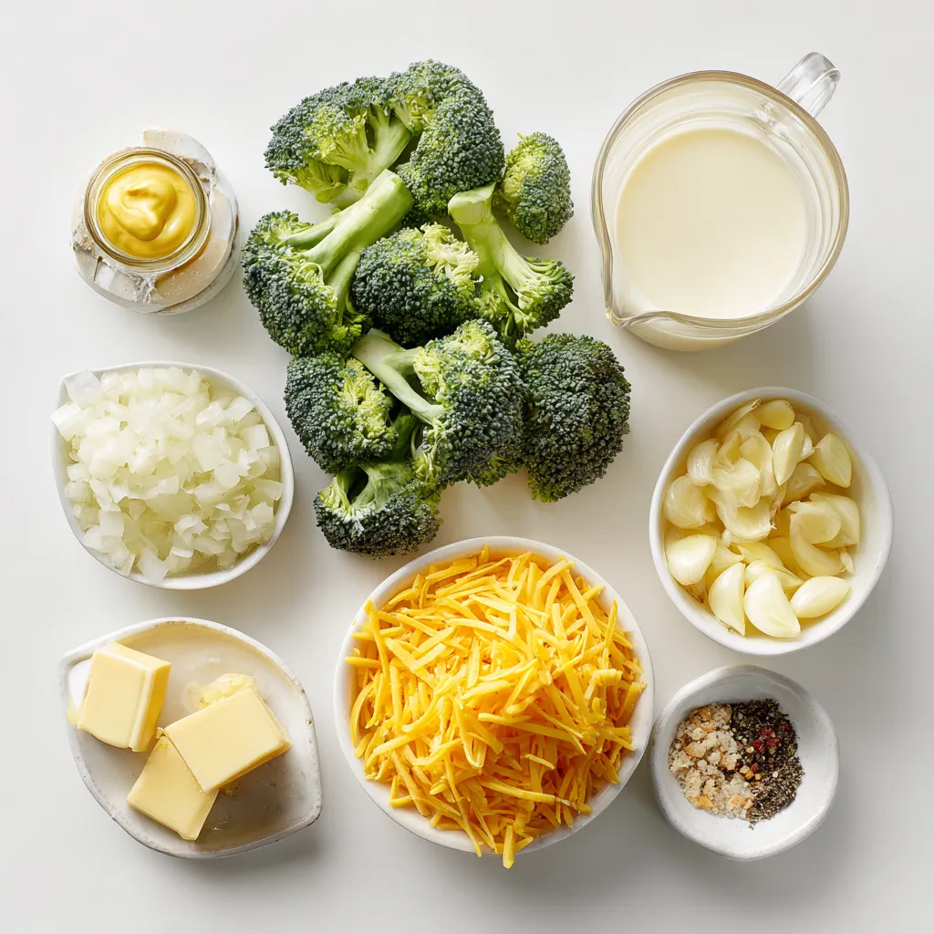 Für die cremige Brokkoli-Cheddar-Suppe benötigen wir einige einfache, aber frische Zutaten: