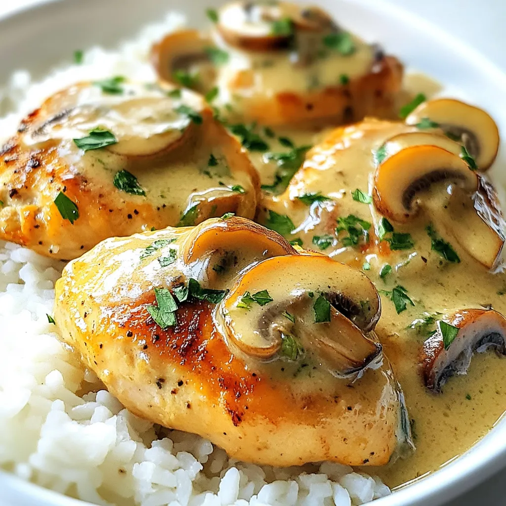 Ein herzhaftes Gericht mit zarten Hähnchenbrustfilets in einer cremigen Knoblauch-Pilzsauce.