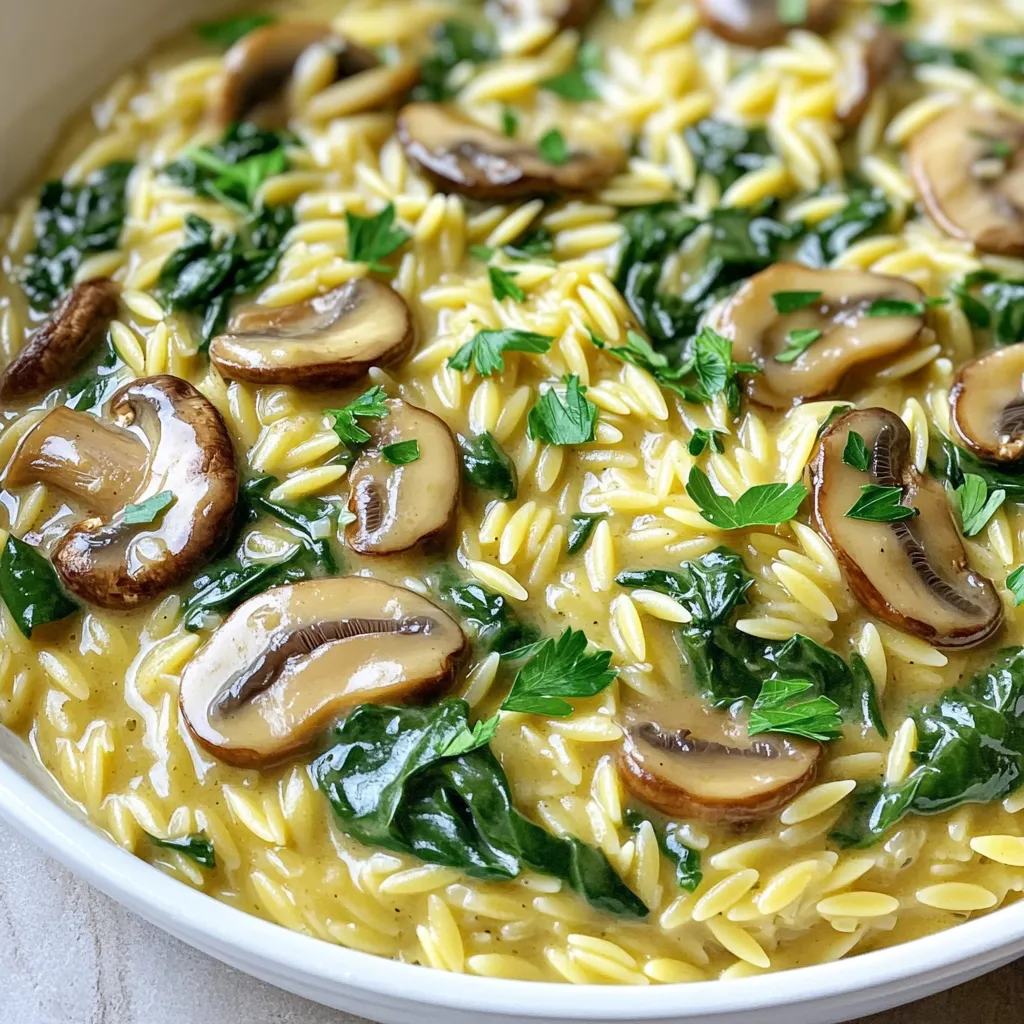 Diese Zutaten machen die Mahlzeit reichhaltig und lecker. Die Orzo-Pasta nimmt die Aromen gut auf. Die Pilze und der Spinat bringen Frische und Farbe.