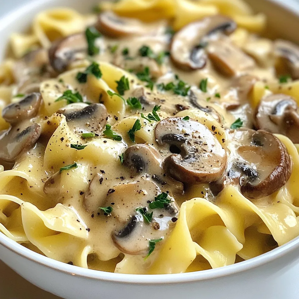 Ein köstlicher und cremiger Pilz Stroganoff, der perfekt zu breiten Eiernudeln passt.