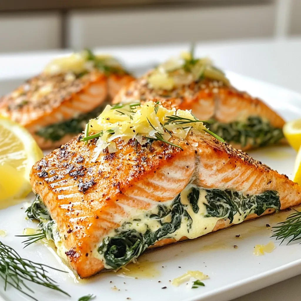Ein köstliches Gericht mit Lachsfilets, gefüllt mit einer cremigen Mischung aus Spinat und Knoblauch.