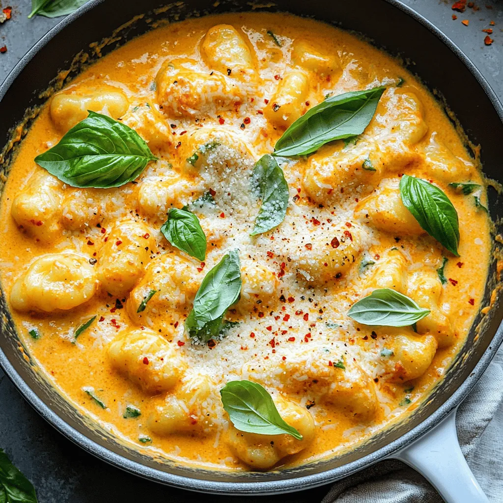 - 1 Packung (450 g) Kartoffelgnocchi - 2 große geröstete rote Paprika, geschält und grob gehackt - 240 ml Schlagsahne Die Hauptzutaten sind der Schlüssel zu einer leckeren Gnocchi-Pfanne. Kartoffelgnocchi sind weich und nehmen den Geschmack gut auf. Geröstete rote Paprika bringen Süße und Farbe. Die Schlagsahne sorgt für die cremige Textur der Sauce. - 2 Esslöffel Olivenöl - 3 Knoblauchzehen, fein gehackt - 1 Teelöffel geräuchertes Paprikapulver Olivenöl ist perfekt für das Anbraten. Es hat einen milden Geschmack. Knoblauch gibt der Pfanne ein tolles Aroma. Geräuchertes Paprikapulver bringt eine rauchige Note und Tiefe in das Gericht. - 50 g frisch geriebener Parmesan - Frisch gebrochene Basilikumblätter - Chiliflocken für einen scharfen Kick Das Topping macht das Gericht besonders. Parmesan fügt einen würzigen Geschmack hinzu. Basilikum bringt Frische und Farbe. Chiliflocken geben einen kleinen Kick, wenn du es scharf magst. Um die Gnocchi perfekt zu kochen, bringe einen großen Topf mit gesalzenem Wasser zum Kochen. Gib die Gnocchi vorsichtig hinein. Sie sind fertig, wenn sie an die Oberfläche steigen, etwa nach 2-3 Minuten. Achte darauf, sie nicht zu lange zu kochen. Das kann die Textur ruinieren. In einer großen Pfanne erhitze 2 Esslöffel Olivenöl bei mittlerer Hitze. Füge die fein gehackten Knoblauchzehen hinzu. Brate den Knoblauch etwa 1 Minute an, bis er duftet. Es ist wichtig, dass der Knoblauch nicht verbrennt, da er sonst bitter wird. Jetzt füge die grob gehackten, gerösteten Paprika hinzu und rühre sie für etwa 2 Minuten unter. Gieße 240 ml Schlagsahne in die Pfanne. Streue 1 Teelöffel geräuchertes Paprikapulver dazu. Rühre gut um und bringe die Mischung leicht zum Köcheln. Diese Schritte sind wichtig, um die richtige Konsistenz zu erreichen. Die Sauce sollte cremig, aber nicht zu dick sein. Füge nach und nach 50 g frisch geriebenen Parmesan zur Sauce hinzu. Rühre kontinuierlich, bis der Käse schmilzt. Dies sorgt für eine schöne, glatte Sauce. Dann gib die gekochten Gnocchi in die Pfanne. Hebe sie vorsichtig unter die Sauce, bis sie gleichmäßig bedeckt sind und warm werden. Nehme die Pfanne vom Herd, wenn alles gut erhitzt ist. Richte die Gnocchi auf Tellern an. Garniere sie mit frischen Basilikumblättern und, wenn gewünscht, mit Chiliflocken für etwas Schärfe. Die Präsentation macht das Gericht noch einladender. Um tolle Gnocchi zu machen, achte auf diese Punkte: - Wasser richtig salzen: Verwende genug Salz im Wasser. Das gibt den Gnocchi Geschmack. - Kochen nicht übertreiben: Gnocchi sind fertig, wenn sie an die Oberfläche steigen. Das dauert etwa 2-3 Minuten. Wenn du die Gnocchi zu lange kochst, werden sie weich und matschig. Achte darauf, sie rechtzeitig abzuschütten. Eine leckere Sauce macht das Gericht besonders. Hier sind einige Tipps: - Variationen der Sahnesorten: Du kannst auch saure Sahne oder Frischkäse verwenden. Diese Optionen geben der Sauce einen anderen Geschmack. - Gewürzvarianten für zusätzlichen Geschmack: Probiere verschiedene Gewürze aus! Zum Beispiel, Thymian oder Oregano passen gut. Ein Hauch von Zitronensaft bringt Frische in die Sauce. Diese kleinen Änderungen machen viel aus und geben dir die Chance, kreativ zu sein. Beim Kochen kann viel schiefgehen. Hier sind einige häufige Fehler und wie du sie vermeidest: - Zu viel Hitze: Wenn die Hitze zu hoch ist, kann die Sauce brennen. Halte die Hitze auf mittlerer Stufe. - Nicht genug umrühren: Rühre die Sauce regelmäßig. So wird sie gleichmäßig dick und klebt nicht am Boden der Pfanne. Falls du die Sauce zu dick findest, kannst du etwas mehr Sahne oder Wasser hinzufügen. So bleibt alles schön cremig. {{image_4}} Sie können die Gnocchi-Pfanne leicht anpassen. Fügen Sie zusätzliches Gemüse hinzu, um mehr Farbe und Nährstoffe zu erhalten. Brokkoli, Spinat oder Zucchini passen gut. Sie bringen Frische und Textur in das Gericht. Für eine Fusion der Geschmäcker probieren Sie asiatische Einflüsse. Fügen Sie etwas Karotten und Erbsen hinzu oder verwenden Sie Sojasauce für einen anderen Kick. Um das Gericht zu bereichern, können Sie Protein hinzufügen. Hähnchenbrust oder Speck geben einen herzhaften Geschmack. Braten Sie das Fleisch zuerst an, bevor Sie die Gnocchi hinzufügen. Für eine pflanzliche Option sind Kichererbsen oder Tofu ideal. Sie nehmen die Aromen der Sauce gut auf und machen das Gericht sättigend. Wenn Sie glutenfrei essen, gibt es gute Alternativen. Suchen Sie nach glutenfreien Gnocchi aus Mais oder Reis. Diese sind leicht erhältlich und schmecken lecker. Außerdem können Sie die Sauce anpassen. Verwenden Sie Kokosnuss- oder Mandelmilch anstelle von Schlagsahne. Diese Optionen sind leicht und gesund. Um die Reste deiner cremigen Gnocchi-Pfanne richtig zu lagern, benutze einen luftdichten Behälter. Stelle sicher, dass der Behälter gut verschlossen ist, damit keine Luft eindringt. So bleiben die Aromen frisch. Lagere die Pfanne im Kühlschrank. Dort hält sie sich bis zu drei Tage. Wenn du die Gnocchi-Pfanne länger aufbewahren möchtest, kannst du sie auch einfrieren. Fülle die Gnocchi in einen gefrierfesten Behälter oder Beutel. Achte darauf, so viel Luft wie möglich herauszudrücken. So bleibt die Qualität erhalten. Eingefroren hält das Gericht bis zu drei Monate. Die beste Methode, um die Gnocchi-Pfanne wieder aufzuwärmen, ist die Mikrowelle oder der Herd. Wenn du den Herd benutzt, erhitze die Pfanne bei niedriger Hitze. Füge einen Spritzer Wasser oder etwas Sahne hinzu, um die Sauce cremig zu halten. Rühre die Gnocchi gut um, um gleichmäßige Wärme zu erreichen. Wenn du die Mikrowelle nutzt, erwärme die Portion in kurzen Abständen von 30 Sekunden. So kannst du die Gnocchi gut im Blick behalten. Achte darauf, die Gnocchi nicht zu lange zu erhitzen, um ein Austrocknen zu vermeiden. Die Haltbarkeit der cremigen Gnocchi-Pfanne beträgt im Kühlschrank etwa drei Tage. Achte darauf, die Reste gut zu lagern. Wen