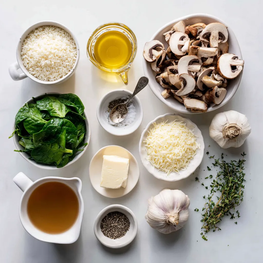 Die Hauptzutaten sind einfach und frisch. Arborio Reis ist ideal, da er viel Flüssigkeit aufnimmt und cremig wird. Pilze bringen einen herzhaften Geschmack. Spinat fügt Farbe und Nährstoffe hinzu. Zwiebeln und Knoblauch geben eine aromatische Basis. Frischkäse und Parmesan verleihen das cremige Element.