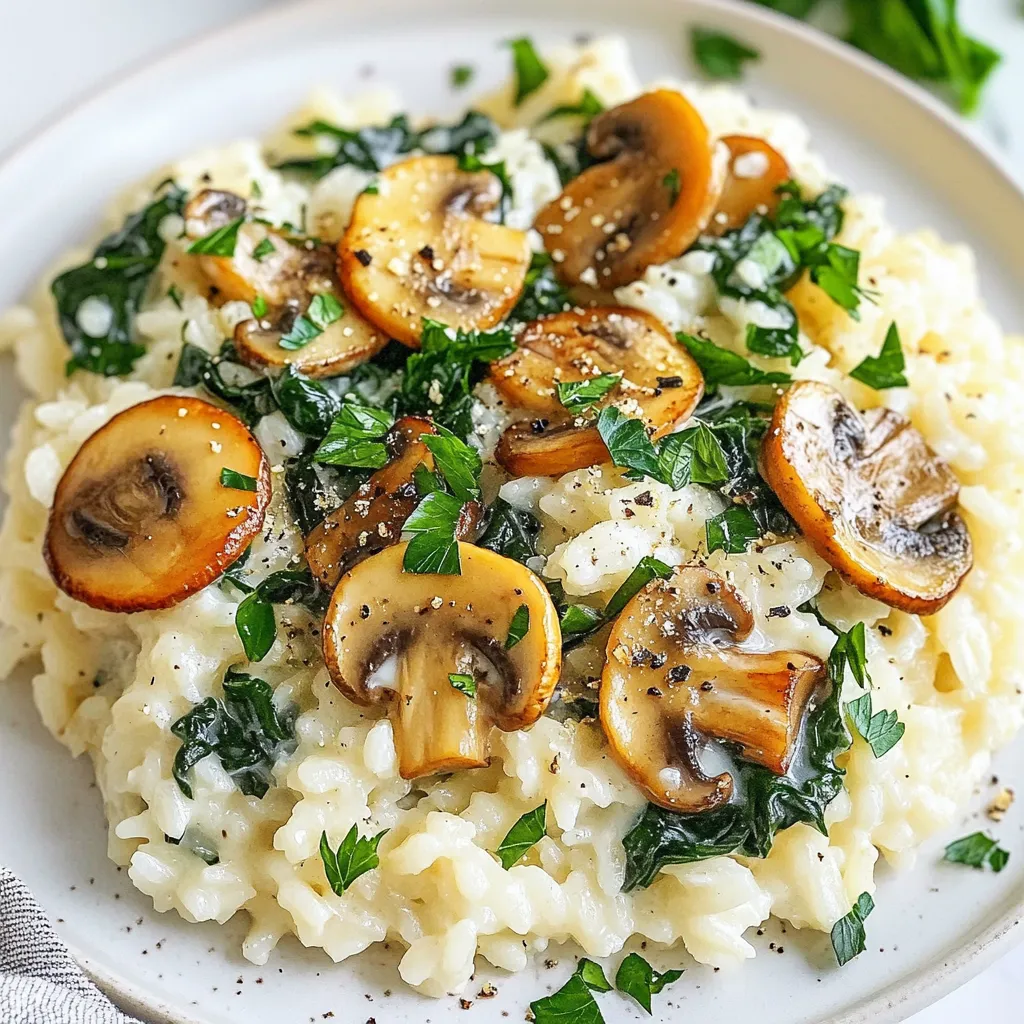 Ein köstliches und cremiges Reisgericht mit Pilzen und Spinat, perfekt für ein schnelles Abendessen.