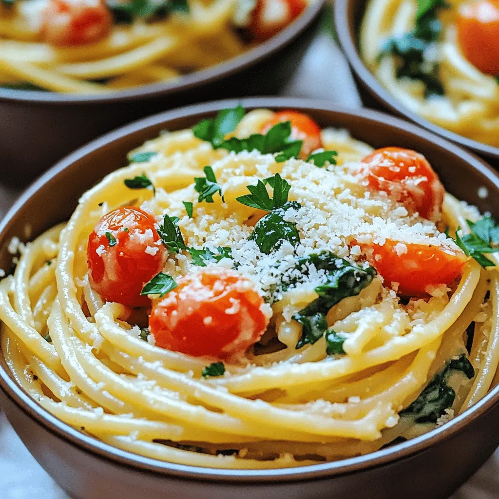 Zuerst musst du alle Zutaten vorbereiten. Nimm 340 g Spaghetti und lege sie bereit. Hacke 4 Knoblauchzehen fein und stelle sie in eine Schüssel. Halbiere 150 g Kirschtomaten und lege sie zur Seite. Reibe 100 g Parmesan und halte etwas für das Servieren zurück. Denke daran, frischen Spinat und gehackte Petersilie für die Garnitur zu benutzen.