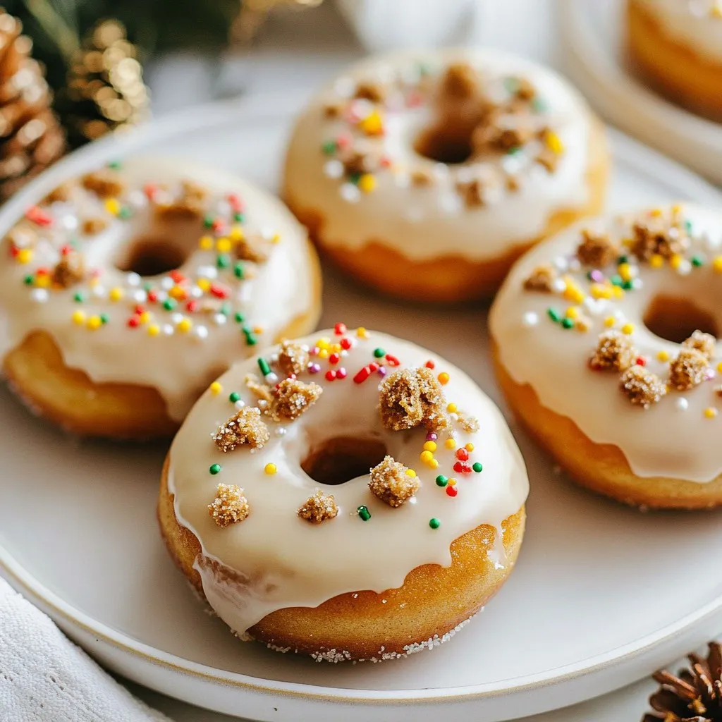 Arrangieren Sie die glasierten Donuts auf einem festlichen Teller und dekorieren Sie sie mit einer Prise Zimt oder einem Zimtstängel für zusätzlichen Feiertagszauber.