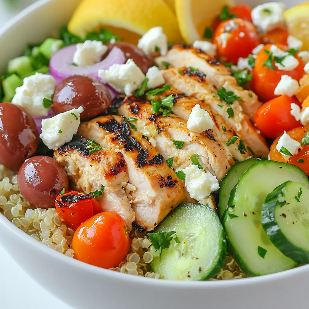 Beginnen Sie mit einer Basis aus gekochtem Quinoa in jeder Schale. Darauf legen Sie die geschnittenen Hähnchenbrustfilets. Fügen Sie die Kirschtomaten, Gurken, rote Zwiebel, Oliven und zerbröselten Feta-Käse hinzu. Zum Schluss bestreuen Sie die Bowls mit frischer Petersilie. Legen Sie einen Zitronenschnitz an die Seite für extra Frische. So sieht Ihre Bowl nicht nur gut aus, sondern schmeckt auch köstlich.