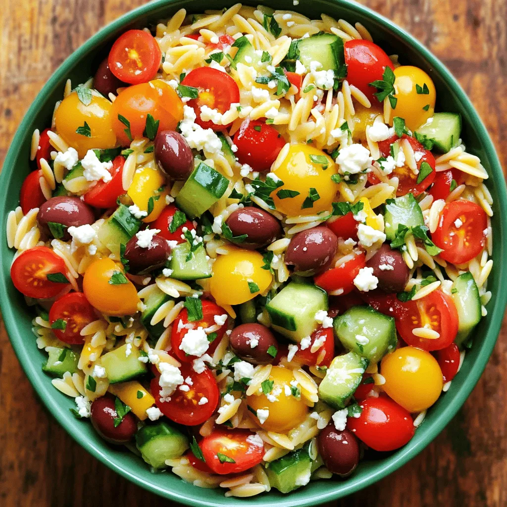Die Hauptzutaten für diesen Salat machen ihn frisch und bunt. Orzo-Nudeln sind klein, ähnlich wie Reis, und nehmen die Aromen gut auf. Cherrytomaten bringen Süße, während Gurke und Paprika Knackigkeit bieten. Rote Zwiebeln fügen einen scharfen Geschmack hinzu. Kalamata-Oliven geben einen salzigen Kick und Feta-Käse sorgt für Cremigkeit.