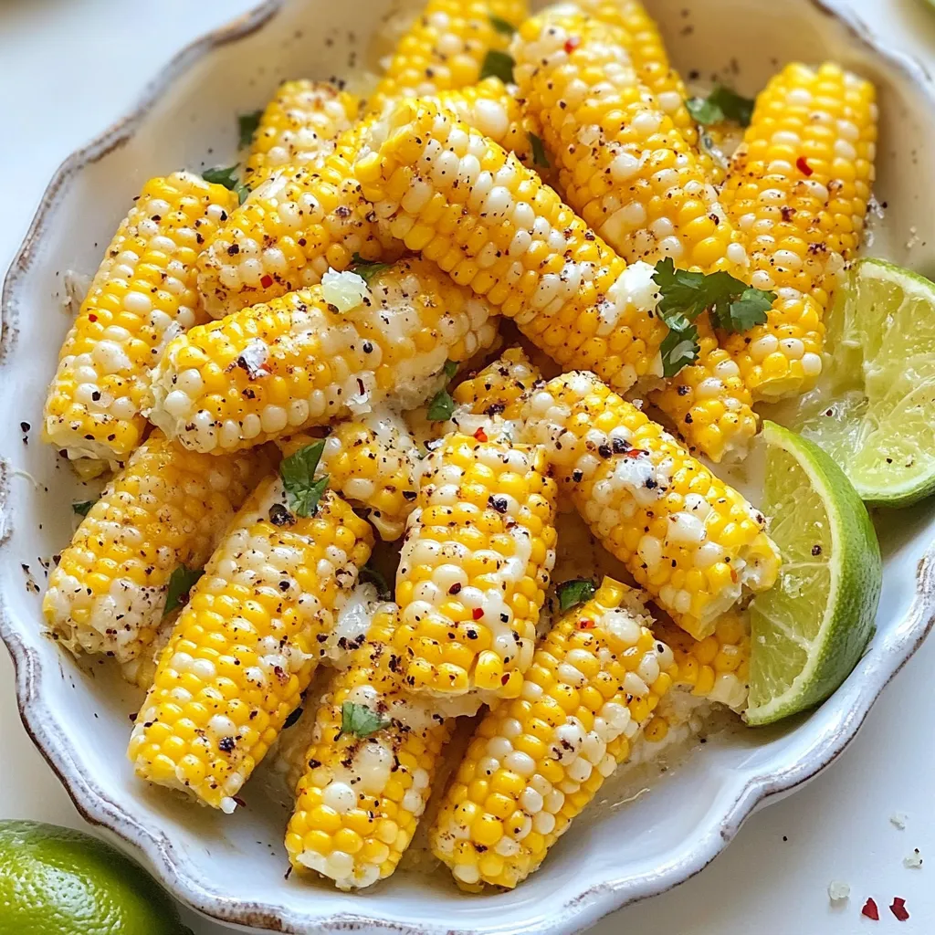 Serviere den Mais in einer schönen Schüssel, mit zusätzlichen Limettenschnitzen am Rand für einen frischen Akzent.