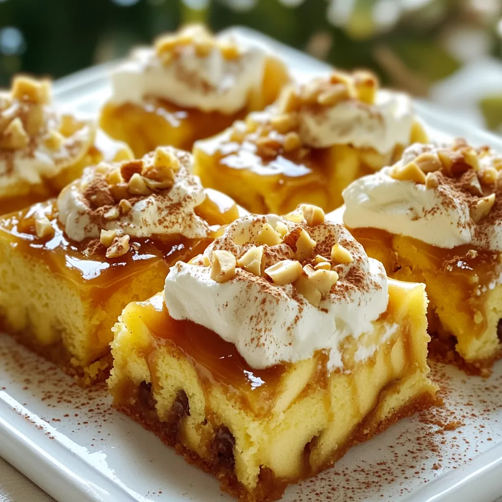 Gieße den Teig in die Backform und streiche ihn glatt. Backe den Kuchen für 25 bis 30 Minuten. Er ist fertig, wenn ein Zahnstocher sauber herauskommt. Lass den Kuchen etwa 10 Minuten abkühlen. Steche dann mit einem Holzlöffel Löcher in die Oberseite. Das lässt die Karamellsauce gut einziehen. Gieße die warme Karamellsauce über den Kuchen. Lass ihn anschließend vollständig abkühlen.