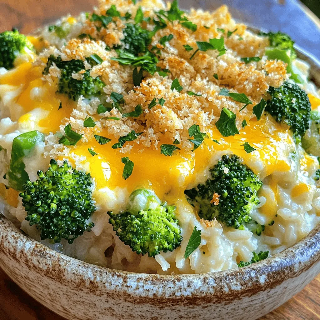 Für eine vegetarische Variante können Sie den Käse-Brokkoli-Reis-Auflauf leicht anpassen. Verwenden Sie einfach Gemüsebrühe anstelle von Milch, um den Geschmack zu intensivieren. Sie können auch mehr Gemüse hinzufügen, wie zum Beispiel Paprika oder Spinat. Diese Optionen machen das Gericht bunter und gesünder.