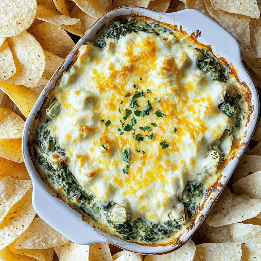 Die Hauptzutaten sind einfach und leicht zu finden. Hier ist, was du brauchst: - 1 Tasse gefrorener Spinat, aufgetaut und gut abgetropft - 1 Tasse eingelegte Artischockenherzen, abgetropft und grob gehackt - 1 Tasse Frischkäse, weich gerührt - 1/2 Tasse saure Sahne - 1 Tasse Mayonnaise - 1 Tasse geriebener Mozzarella-Käse - 1/2 Tasse geriebener Parmesan-Käse - 2 Knoblauchzehen, fein gehackt - 1 Teelöffel Zwiebelpulver - 1 Teelöffel schwarzer Pfeffer - 1/2 Teelöffel zerstoßene rote Pfefferflocken (optional für Schärfe) - Salz nach Geschmack Diese Zutaten schaffen den perfekten Dip. Der Spinat bringt eine schöne Farbe, während die Artischocken einen tollen Geschmack hinzufügen. Manchmal hast du vielleicht nicht alles im Haus. Hier sind einige Alternativen: - Verwende frischen Spinat statt gefrorenem Spinat. - Statt Artischocken kannst du auch Brokkoli verwenden. - Griechischer Joghurt kann die saure Sahne ersetzen. - Für mehr Geschmack kannst du Feta-Käse anstelle von Parmesan probieren. Mit diesen Alternativen bleibt der Dip lecker und spannend. Du kannst auch etwas Kreativität zeigen. Hier sind Vorschläge, was du hinzufügen kannst: - Füge frische Kräuter wie Petersilie oder Basilikum hinzu. - Für zusätzliche Schärfe, probiere Jalapeños. - Mach den Dip noch cremiger mit mehr Frischkäse. - Experimentiere mit verschiedenen Käsesorten, wie Cheddar oder Gouda. Diese Anpassungen machen deinen Käse-Spinat-Artischocken-Dip einzigartig. So kannst du ihn immer wieder neu genießen! Zuerst heizen Sie Ihren Ofen auf 175°C vor. Das ist wichtig, damit der Dip perfekt backt. Nehmen Sie eine große Rührschüssel. Hier geben Sie die weiche Frischkäse, die saure Sahne und die Mayonnaise hinein. Mischen Sie alles gut. Verwenden Sie einen Handmixer, um die Mischung cremig zu machen. Jetzt kommt der spannende Teil. Fügen Sie die gehackten Knoblauchzehen, das Zwiebelpulver und den schwarzen Pfeffer hinzu. Wenn Sie es gerne scharf mögen, können Sie auch die roten Pfefferflocken verwenden. Rühren Sie alles ordentlich um. Dann heben Sie vorsichtig den abgetropften Spinat und die gehackten Artischocken unter. Achten Sie darauf, dass alles gut verteilt ist. Jetzt ist es Zeit für den Käse! Geben Sie den geriebenen Mozzarella und Parmesan dazu. Mischen Sie alles gründlich, bis der Käse gleichmäßig in der Mischung ist. Übertragen Sie die Dip-Mischung in eine ofenfeste Auflaufform. Verteilen Sie die Mischung gleichmäßig. Jetzt kommt der Ofen ins Spiel! Backen Sie den Dip 25-30 Minuten. Achten Sie darauf, dass die Oberseite blubbernd und goldbraun ist. Nehmen Sie das Gericht vorsichtig aus dem Ofen und lassen Sie es kurz abkühlen. Servieren Sie den Dip warm mit Tortillachips oder frischem Gemüse. Ein Hauch von zusätzlichem Parmesan macht das Gericht noch besser. Um die perfekte Konsistenz zu erreichen, nutzen Sie einen Handmixer. Mischen Sie den Frischkäse, die saure Sahne und die Mayonnaise gut. Achten Sie darauf, dass keine Klumpen bleiben. Wenn der Dip zu dick ist, fügen Sie etwas mehr saure Sahne hinzu. Ist er zu dünn, kann mehr Frischkäse helfen. Sie können den Dip nach Ihrem Geschmack anpassen. Fügen Sie zum Beispiel frische Kräuter hinzu, wie Basilikum oder Petersilie. Für einen würzigen Kick verwenden Sie mehr zerstoßene rote Pfefferflocken. Wenn Sie es cremiger mögen, probieren Sie etwas mehr Parmesan. Auch ein Spritzer Zitronensaft kann helfen, den Geschmack aufzuhellen. Servieren Sie den Dip warm für den besten Genuss. Nutzen Sie eine schöne Auflaufform. Streuen Sie etwas Parmesan und frische Kräuter oben drauf. Das sieht nicht nur gut aus, sondern bringt auch mehr Geschmack. Dazu passen Tortillachips, Baguettes oder frisches Gemüse. Die Farben und Texturen machen das Gericht noch ansprechender. {{image_4}} Für eine vegetarische Version des Käse-Spinat-Artischocken-Dips können Sie alle Zutaten verwenden. Achten Sie darauf, dass die Mayonnaise und der Käse ohne tierische Produkte sind. Viele Marken bieten gute Alternativen an. Für glutenfreie Optionen prüfen Sie die Zutatenliste von Tortillachips oder Baguette. Viele Marken sind glutenfrei, sodass Sie sicher snacken können. Wenn Sie den Käse ersetzen möchten, probieren Sie einen veganen Frischkäse oder Hefeflocken. Diese geben einen leckeren, käsigen Geschmack. Für einen besonderen Twist könnten Sie Feta oder Blauschimmelkäse hinzufügen. Das bringt eine neue Dimension in den Dip. Auch etwas Zitronensaft oder frische Kräuter wie Basilikum können den Geschmack aufpeppen. Experimentieren Sie, um Ihre perfekte Mischung zu finden. Für einen scharfen Spinat-Artischocken-Dip fügen Sie etwas Jalapeño oder scharfe Sauce hinzu. Die Menge hängt von Ihrem Geschmack ab. Mischen Sie die scharfen Zutaten in die Dip-Mischung, bevor Sie alles backen. Ein scharfer Dip passt gut zu kalten Getränken. Servieren Sie ihn mit frischem Gemüse oder Chips. So wird er zum Hit auf jeder Party! Nach dem Kochen können Sie den Dip im Kühlschrank aufbewahren. Legen Sie ihn in einen luftdichten Behälter. So bleibt er frisch. Der Dip hält sich etwa 3 bis 5 Tage im Kühlschrank. Vor dem Servieren einfach gut umrühren und eventuell etwas frischen Käse hinzufügen. Sie können den Dip auch einfrieren. Teilen Sie ihn in Portionen auf, um die Verwendung zu erleichtern. Verwenden Sie gefrierfreundliche Behälter. Der Dip hält sich bis zu 3 Monate im Gefrierfach. Achten Sie darauf, die Oberfläche gut abzudecken, um Gefrierbrand zu vermeiden. Um den gefrorenen Dip wieder zu verwenden, lassen Sie ihn im Kühlschrank auftauen. Das dauert einige Stunden oder über Nacht. Zum Aufwärmen geben Sie den Dip in eine Auflaufform. Erwärmen Sie ihn bei 175°C im Ofen für etwa 20 Minuten. Rühren Sie zwischendurch um, damit er gleichmäßig warm wird. Sie können auch etwas Milch oder Sahne hinzufügen, um die Cremigkeit zu verbessern. Der Käse-Spinat-Artischocken-Dip hält sich gut im Kühlschrank. Er bleibt frisch fü