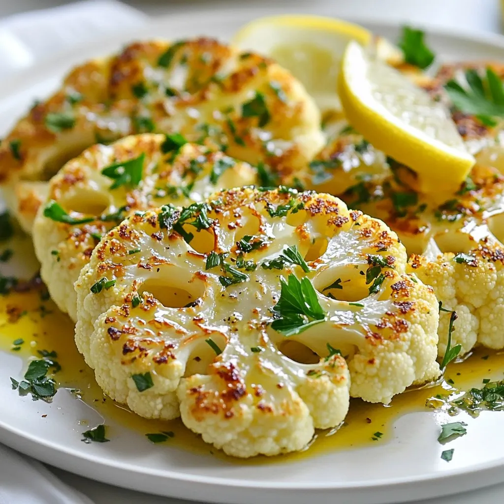 Servieren Sie die Blumenkohlscheiben auf einem schönen Teller und fügen Sie einige Zitronenscheiben daneben hinzu, um eine frische Note zu betonen.