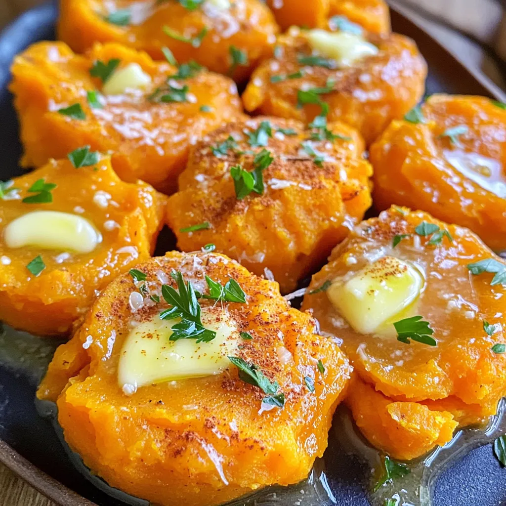 Übertragen Sie die stampften Süßkartoffeln auf eine Servierplatte. Wenn Sie möchten, träufeln Sie einen weiteren Schuss geschmolzene Butter darüber. Garnieren Sie das Gericht mit gehackter frischer Petersilie. Das gibt einen tollen frischen Akzent und sieht schön aus.