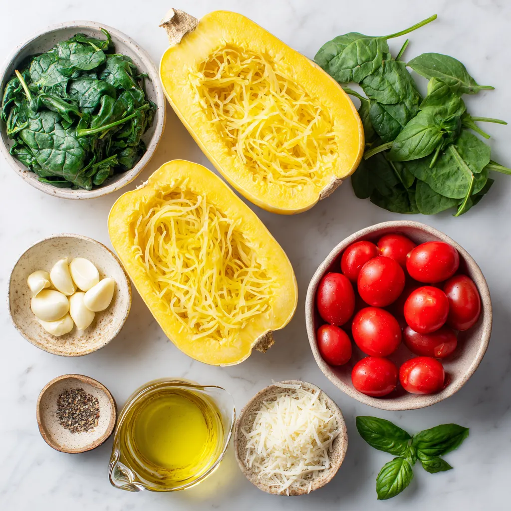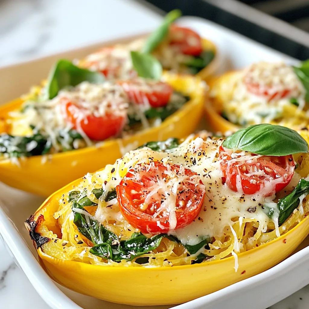 - 1 mittelgroßer Spaghetti Kürbis - 4 Esslöffel Olivenöl - 4 Knoblauchzehen - 1 Tasse frischer Spinat - 1 Tasse Kirschtomaten - 1 Teelöffel italienische Gewürzmischung - 1/2 Tasse geriebener Parmesan - Salz und Pfeffer nach Geschmack Ich liebe, wie einfach dieses Rezept ist. Du brauchst nur wenige Zutaten. Hauptzutaten: Der Spaghetti Kürbis ist die Hauptzutat. Er hat eine tolle Textur. Olivenöl gibt Geschmack und hilft beim Rösten. Knoblauch bringt ein tolles Aroma. Gemüse und Gewürze: Frischer Spinat ist lecker und gesund. Kirschtomaten fügen süße Noten hinzu. Die italienische Gewürzmischung gibt dem Gericht Tiefe. Käseschicht: Parmesan ist der Star der Show. Er schmilzt gut und hat einen tollen Geschmack. Salz und Pfeffer sorgen für den perfekten Ausgleich. Jede Zutat spielt eine wichtige Rolle. Wenn du die richtigen Zutaten hast, wird dein Gericht köstlich. {{ingredient_image_2}} Zuerst heizen Sie den Ofen auf 200 °C vor. Dann schneiden Sie den Spaghetti Kürbis vorsichtig der Länge nach durch. Entfernen Sie die Kerne mit einem Löffel. Achten Sie darauf, dass Sie alle Kerne herausbekommen. Bestreichen Sie die Innenseiten jeder Kürbishälfte mit 2 Esslöffeln Olivenöl. Würzen Sie die Innenseiten mit Salz und Pfeffer. Dies gibt dem Kürbis einen tollen Geschmack. Legen Sie die Kürbishälften mit der Schnittfläche nach unten auf ein Backblech. Rösten Sie den Kürbis im Ofen für 30-40 Minuten. Die Garzeit hängt von der Größe des Kürbisses ab. Prüfen Sie, ob das Fruchtfleisch weich ist. Sie können dies tun, indem Sie mit einer Gabel hineinstochen. Wenn Sie die Gabel leicht hineinstecken können, ist der Kürbis fertig. Während der Kürbis röstet, erhitzen Sie die restlichen 2 Esslöffel Olivenöl in einer großen Pfanne. Fügen Sie den gehackten Knoblauch hinzu. Dünsten Sie ihn für etwa 1 Minute, bis er duftet. Achten Sie darauf, dass der Knoblauch nicht braun wird. Rühren Sie dann den gehackten Spinat und die Kirschtomaten ein. Braten Sie diese Mischung 3-4 Minuten weiter. Der Spinat sollte zusammenfallen, und die Tomaten leicht weich werden. Nehmen Sie die Pfanne vom Herd. Mischen Sie den geriebenen Parmesan und die italienische Gewürzmischung unter. Passen Sie die Würze mit Salz und Pfeffer an. Wenn der Spaghetti Kürbis gar ist, ziehen Sie das Fruchtfleisch mit einer Gabel in spaghettiartige Stränge. Mischen Sie diese vorsichtig mit der Knoblauch-, Spinat- und Tomatenmischung. Füllen Sie die Mischung wieder in die Kürbishälften. Stellen Sie die gefüllten Kürbisboote zurück in den Ofen. Backen Sie sie für weitere 10 Minuten, bis sie durchgewärmt und leicht goldbraun sind. Die optimale Temperatur für das Rösten ist 200 °C. Rösten Sie den Kürbis für 30 bis 40 Minuten. Er sollte weich sein und sich leicht mit einer Gabel zerteilen lassen. So bekommt die Textur die richtige Konsistenz. Wenn Ihr Kürbis zu fest bleibt, lassen Sie ihn einfach länger im Ofen. Um den Geschmack zu verfeinern, probieren Sie verschiedene Gewürze. Fügen Sie zum Beispiel geräuchertes Paprikapulver oder Kreuzkümmel hinzu. Frische Kräuter wie Thymian oder Oregano passen ebenfalls gut. Sie können auch etwas Zitronensaft für eine frische Note verwenden. Für die Präsentation garnieren Sie die Kürbisboote mit frischen Basilikumblättern. Ein zusätzlicher Spritzer Parmesan macht sie noch ansprechender. Servieren Sie dazu einen einfachen grünen Salat oder knuspriges Brot. So wird Ihr Gericht noch leckerer und sieht toll aus. Pro Tipps Wählen Sie den perfekten Kürbis: Achten Sie darauf, einen Spaghetti Kürbis zu wählen, der fest und schwer für seine Größe ist, um optimalen Geschmack und Textur zu gewährleisten. Vorsicht beim Rösten: Überwachen Sie den Kürbis während des Röstens, um sicherzustellen, dass er nicht zu weich wird; die ideale Konsistenz ist al dente. Variieren Sie die Füllung: Fühlen Sie sich frei, die Füllung mit anderen Gemüsesorten oder Proteinen wie Hähnchen oder Tofu zu variieren, um neue Geschmacksrichtungen zu kreieren. Servieren Sie mit einem Twist: Ein Spritzer frischer Zitronensaft über die gefüllten Kürbisboote kann die Aromen aufhellen und eine erfrischende Note hinzufügen. {{image_4}} Für ein vegetarisches Gericht kannst du andere Gemüsesorten hinzufügen. Zucchini, Paprika und Pilze passen gut. Diese geben deinem Gericht mehr Textur und Geschmack. Du kannst auch Erbsen oder Brokkoli hinzufügen, um die Nährstoffe zu erhöhen. Achte darauf, die Gemüse klein zu schneiden, damit sie gleichmäßig garen. Wenn du Fleisch magst, gibt es viele Optionen. Du kannst Hühnchen oder Speck in die Füllung integrieren. Für Hühnchen empfehle ich, es vorher zu braten und in kleine Stücke zu schneiden. Speck kannst du knusprig braten und vor dem Servieren darüber streuen. Diese Optionen verleihen deinem Gericht einen herzhaften Geschmack. Für eine Low-Carb-Version kannst du die Menge an Spaghetti Kürbis reduzieren. Füge mehr Gemüse wie Blumenkohl oder Zucchini hinzu. Diese sind reich an Ballaststoffen und arm an Kohlenhydraten. Du kannst auch die Parmesanmenge anpassen, um die Kalorien zu senken. Achte darauf, die Gewürze gut zu mischen, um den Geschmack zu erhalten. Du kannst die Knoblauch Parmesan Spaghetti Kürbisboote gut aufbewahren. Stelle sicher, dass sie abgekühlt sind. Lege sie in einen luftdichten Behälter. Im Kühlschrank bleiben sie für 3 bis 5 Tage frisch. Du kannst auch die gefüllten Kürbisboote einfrieren. Wickele sie gut in Frischhaltefolie und lege sie in einen Gefrierbeutel. So bleiben sie bis zu 3 Monate haltbar. Wenn du die gefüllten Kürbisboote wieder aufwärmen möchtest, mache das vorsichtig. Die beste Methode ist, den Ofen auf 180 °C (350 °F) vorzuheizen. Lege die Boote auf ein Backblech und decke sie mit Aluminiumfolie ab. So bleiben sie saftig. Erwärme sie für 15 bis 20 Minuten, bis sie gut durchgewärmt sind. Du kannst sie auch in der Mikrowelle aufwärmen, aber die Textur kan