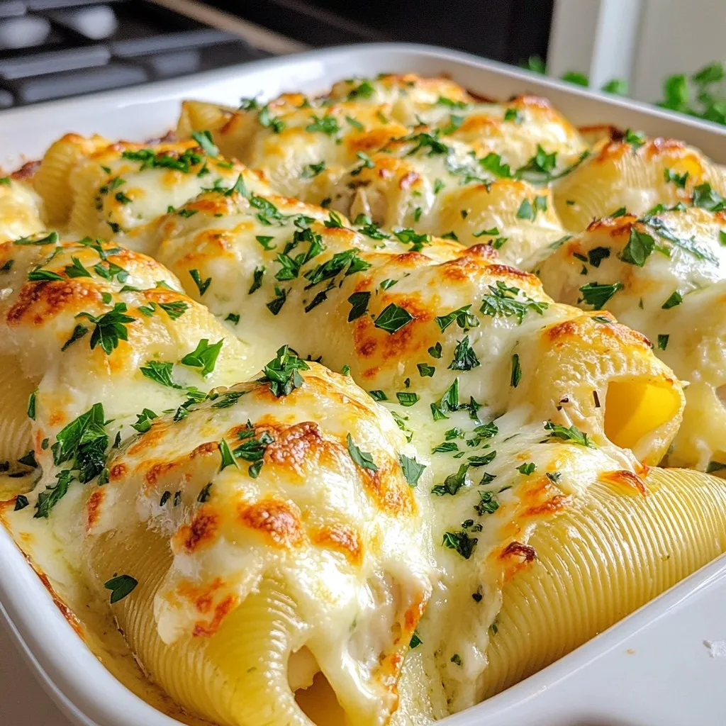 Ein köstliches Gericht mit gefüllten Pastamuscheln, Hühnchen und einer cremigen Alfredo-Sauce.