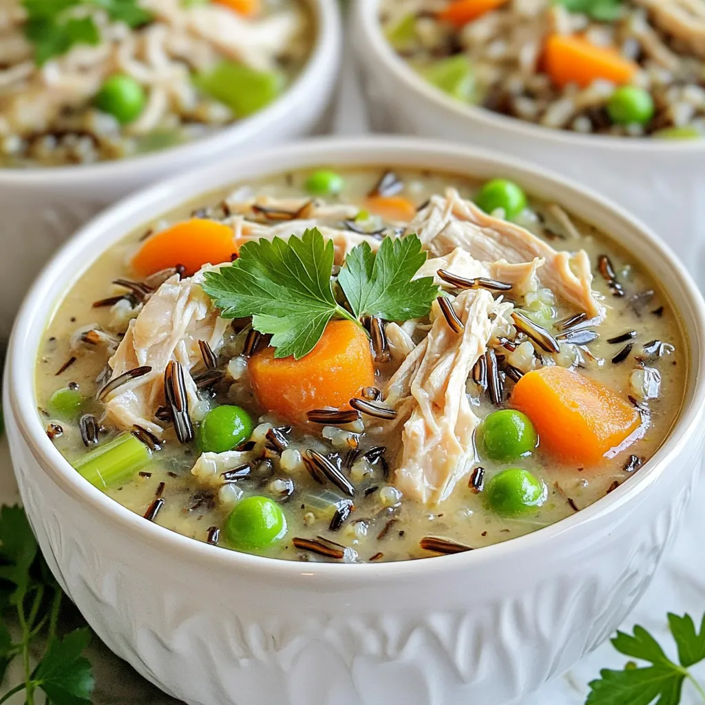 Diese Zutaten machen den Eintopf reichhaltig und schmackhaft. Das Hähnchen gibt viel Geschmack und die Brühe sorgt für eine tolle Basis. Wildreis bringt eine nussige Note und die Gemüse machen alles frisch.
