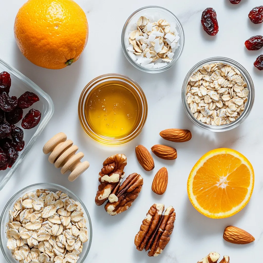 Für mein Cranberry Orange Granola verwende ich frische und gesunde Zutaten. Hier sind die Hauptzutaten: