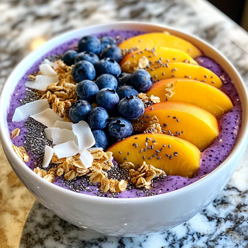 - Erfrischender Genuss: Diese Smoothie-Bowl kombiniert die Süße von Pfirsichen und die Frische von Blaubeeren für einen köstlichen Start in den Tag.