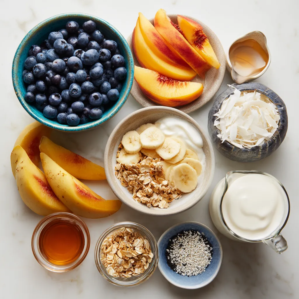 - nach Belieben Toppings: frische Pfirsichscheiben, Blaubeeren, Granola, Chiasamen, Kokosnussflocken