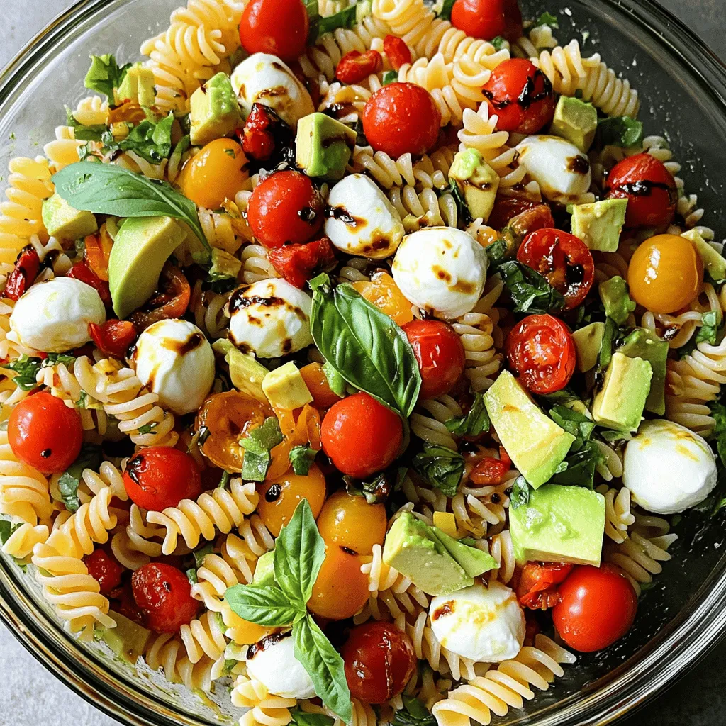 Entdecken Sie unser köstliches Rezept für Caprese Pasta Salad mit einem Twist! Dieser bunte Salat kombiniert Fusilli-Nudeln mit frischen Kirschtomaten, Mozzarella, Avocado und gerösteten Paprika für einen unwiderstehlichen Geschmack. Ideal für warme Tage oder als Beilage zu Grillfesten. Probieren Sie es aus und bringen Sie frischen Wind in Ihre Küche! Klicken Sie jetzt, um das vollständige Rezept und die Zubereitungsschritte zu entdecken!