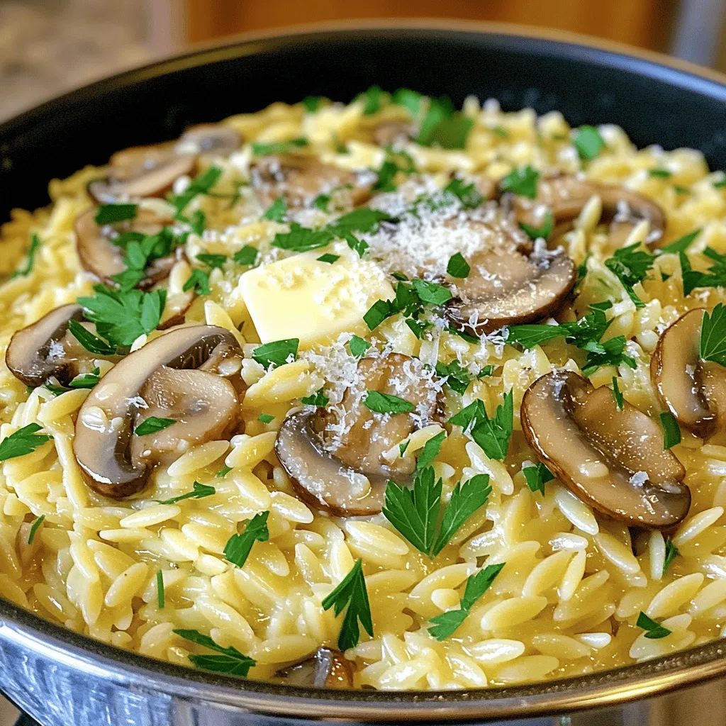 Diese Zutaten machen das Rezept besonders. Die Orzo-Nudeln sind klein und nehmen schnell Aromen auf. Die Butter und der Knoblauch sorgen für einen reichen Geschmack. Cremini-Pilze sind zart und bieten eine tiefe Umami-Note.