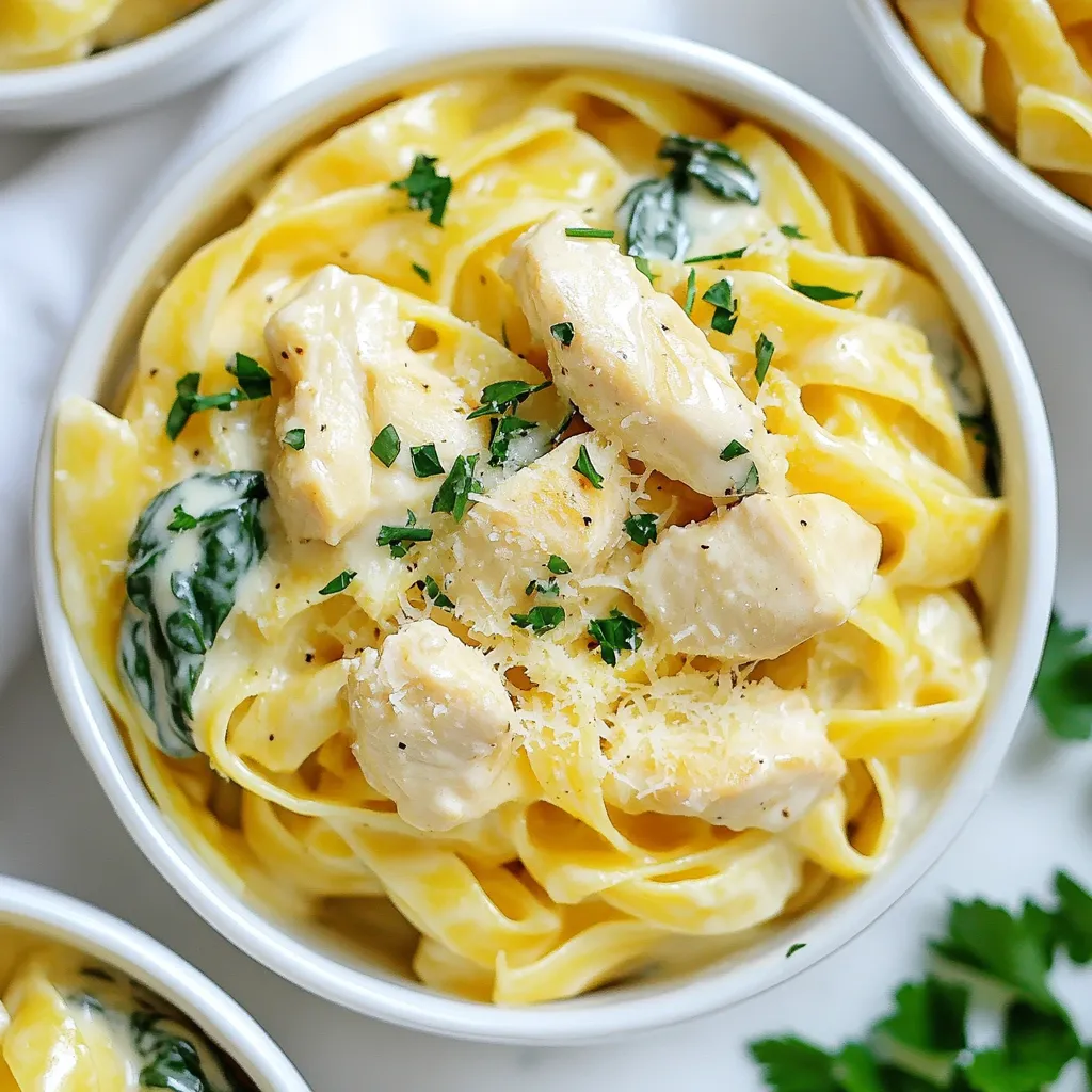Du kannst das Hähnchen schon früher würfeln und im Kühlschrank lagern. So sparst du Zeit beim Kochen. Die Nudeln kannst du ebenfalls vorbereiten, indem du sie in Wasser einweichst. Behalte die Brühe und die Sahne bis zum Kochen. Das macht alles schnell und einfach.