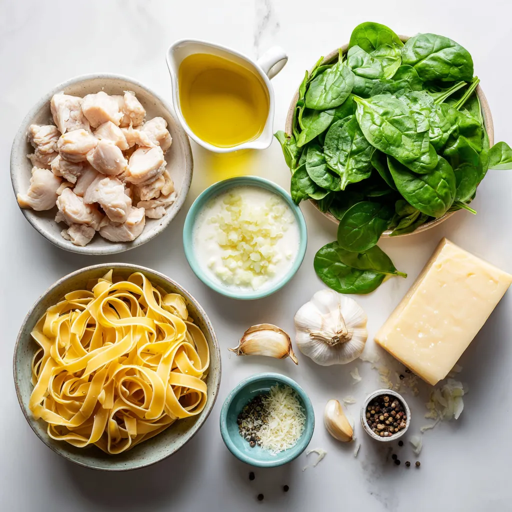 Diese Zutaten sind die Basis für dein schnelles und cremiges Gericht. Die Hähnchenbrust bringt viel Protein. Die Fettuccine-Nudeln machen das Gericht sättigend. Schlagsahne und Parmesan geben der Sauce ihren reichen Geschmack.
