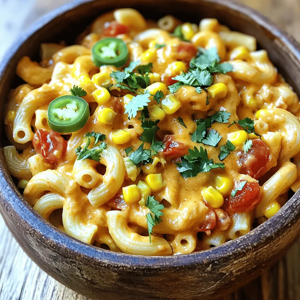 Reduziere die Hitze auf niedrig und decke den Topf ab. Lass das Gericht 10 Minuten köcheln. Rühre zwischendurch um, bis die Pasta weich ist. Wenn die Makkaroni gar sind, gieße die Schlagsahne hinein und mische alles gut. Füge nach und nach den geriebenen Cheddar-Käse hinzu. Rühre weiter, bis der Käse geschmolzen ist. Mische die Maiskörner unter und würze nach Geschmack mit Salz und Pfeffer. Jetzt ist dein Gericht bereit! Serviere die cremige Taco-Mac in Schalen und garniere sie mit frischem Koriander und Jalapeños, wenn du es schärfer magst.