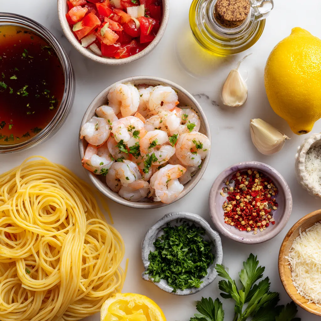 Hauptzutaten für One-Pot Garlic Shrimp Pasta