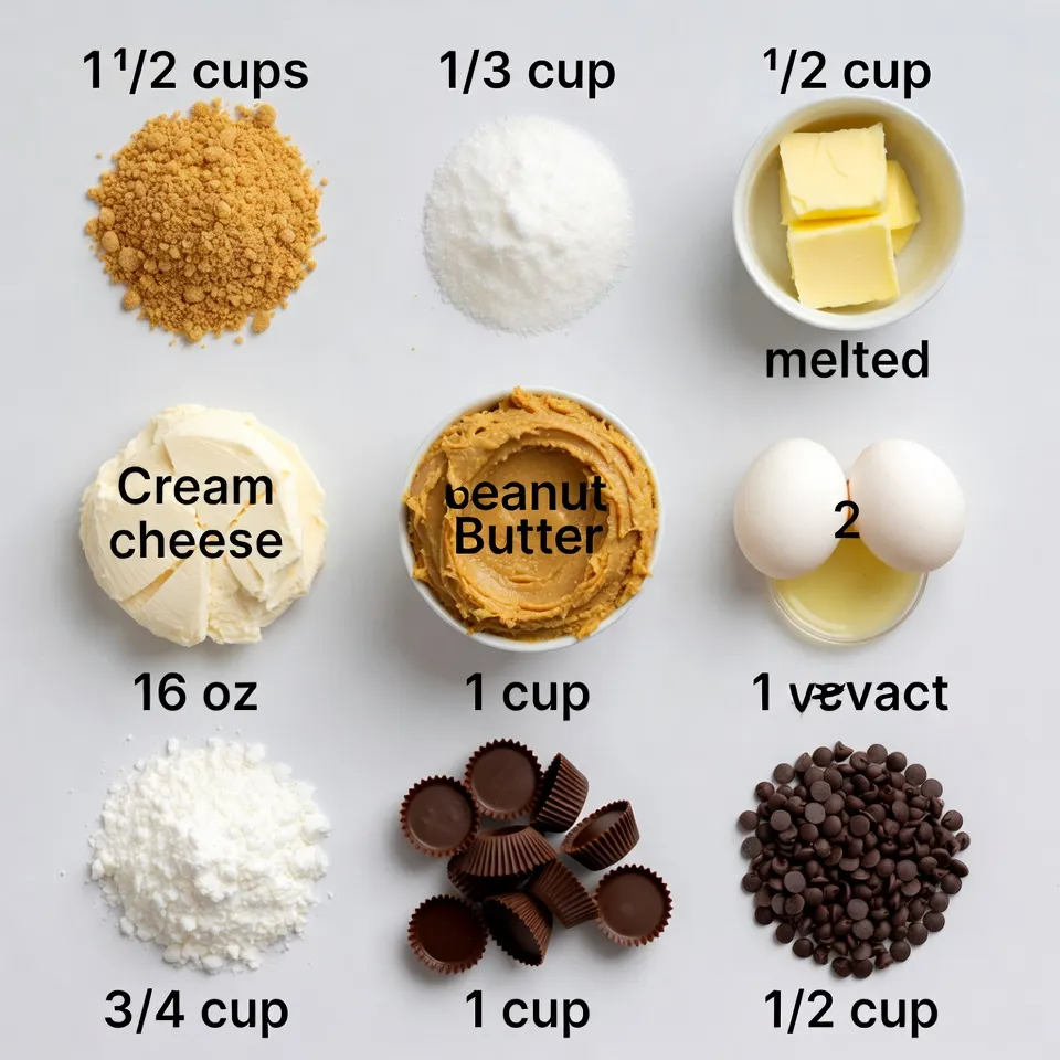 Um diese leckeren Erdnussbutter-Tassen-Käsekuchen-Riegel zuzubereiten, benötigen Sie folgende Zutaten: