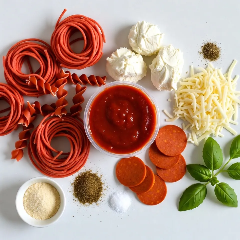 Die Zutaten für den Pepperoni Pizza Auflauf sind einfach und leicht zu finden. Du brauchst zuerst die Hauptbestandteile. Die Rotini-Pasta ist perfekt für diesen Auflauf. Sie hält die Soße gut. Die Marinara-Sauce gibt dem Gericht den klassischen Pizzageschmack. Der Ricotta-Käse fügt eine cremige Textur hinzu.