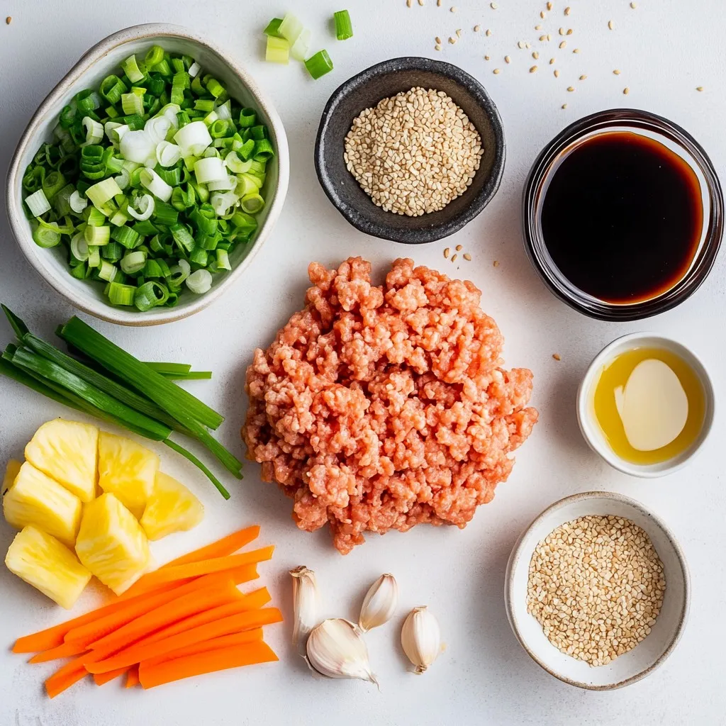 Zuerst sammeln wir alle Zutaten. Sie brauchen 450 g gemahlenes Hähnchen oder Truthahn, 125 g Semmelbrösel, 60 g fein gehackte Frühlingszwiebeln, 1 kleine geriebene Karotte, 1 Esslöffel gehackten Knoblauch, 1 Esslöffel gehackten Ingwer, 1 geschlagenes Ei, Salz und Pfeffer nach Geschmack sowie 150 g Ananasstücke.