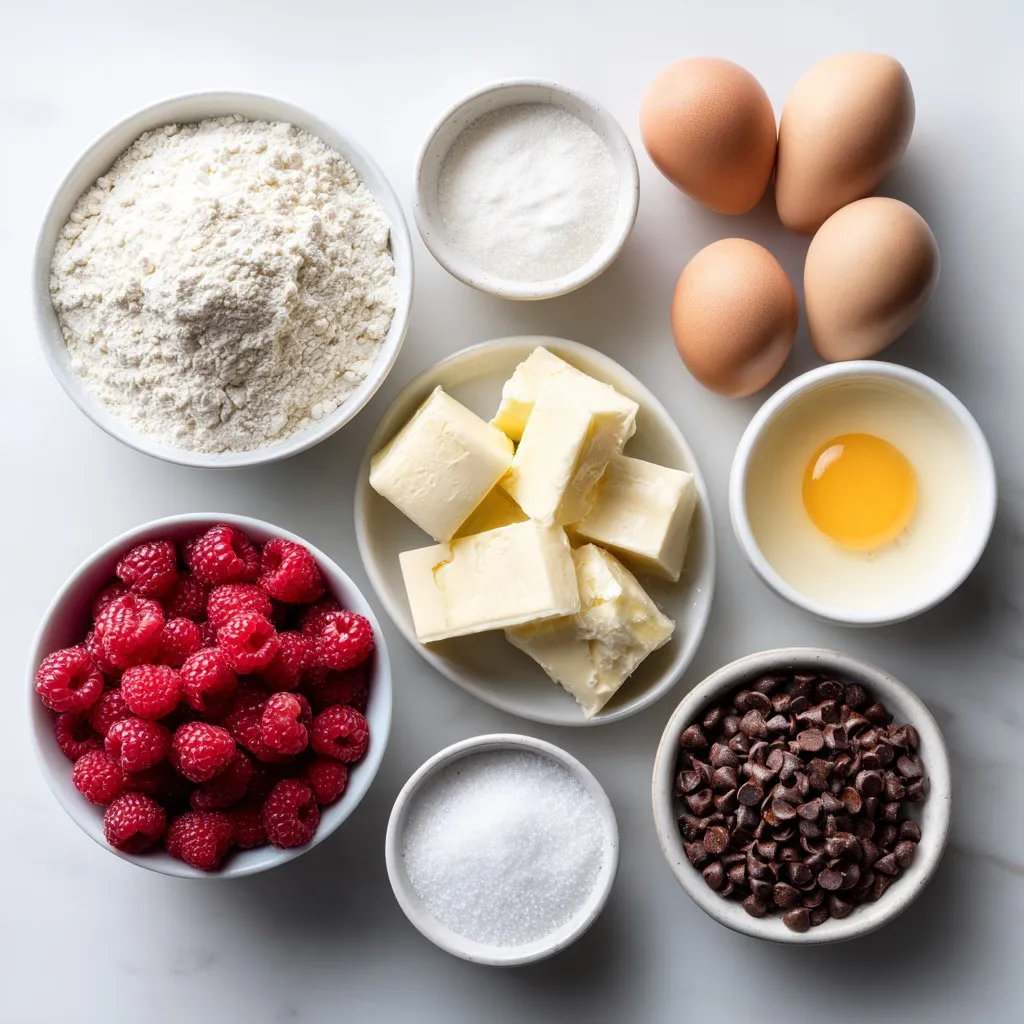 Heize deinen Ofen auf 200°C vor. Das sorgt für eine gleichmäßige Backhitze. Lege ein Backblech mit Backpapier aus. So kleben die Scones nicht fest. Stelle alle Zutaten bereit. Du brauchst Weizenmehl, Zucker, Backpulver, Salz, Butter, Schlagsahne, Ei, Vanilleextrakt, Himbeeren und Schokoladenstückchen.
