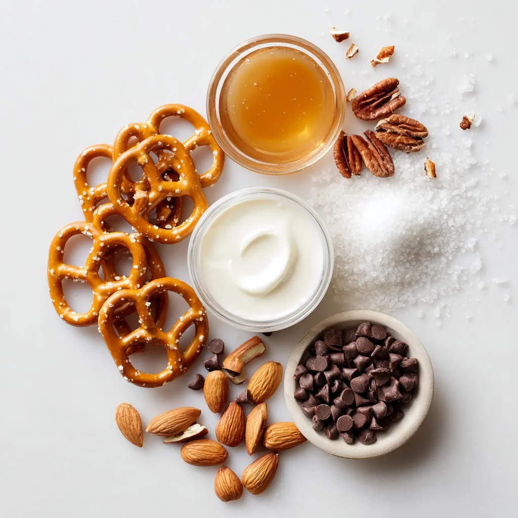 Hauptzutaten für gesalzene Karamell-Pretzel-Bark