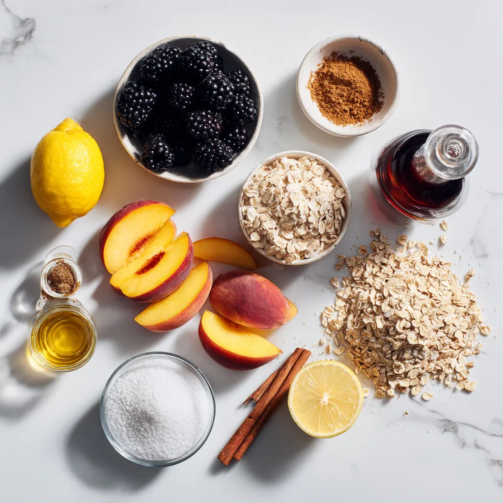 Für einen köstlichen Schwarzbeer-Pfirsich-Crisp benötigst du frische, saftige Zutaten. Hier sind die Hauptzutaten: