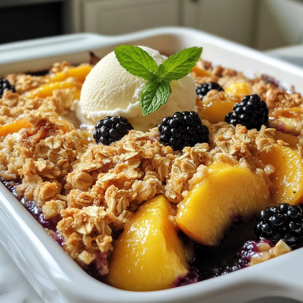 Ein köstlicher und fruchtiger Crisp mit Schwarzbeeren und Pfirsichen, perfekt für den Sommer.