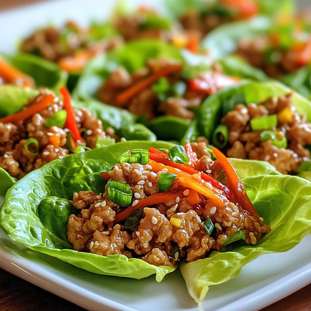 Arrangiere die gefüllten Lettuce-Wraps auf einem großen Teller und serviere sie mit extra Sesamsamen und gehackten Frühlingszwiebeln für eine einladende Note.