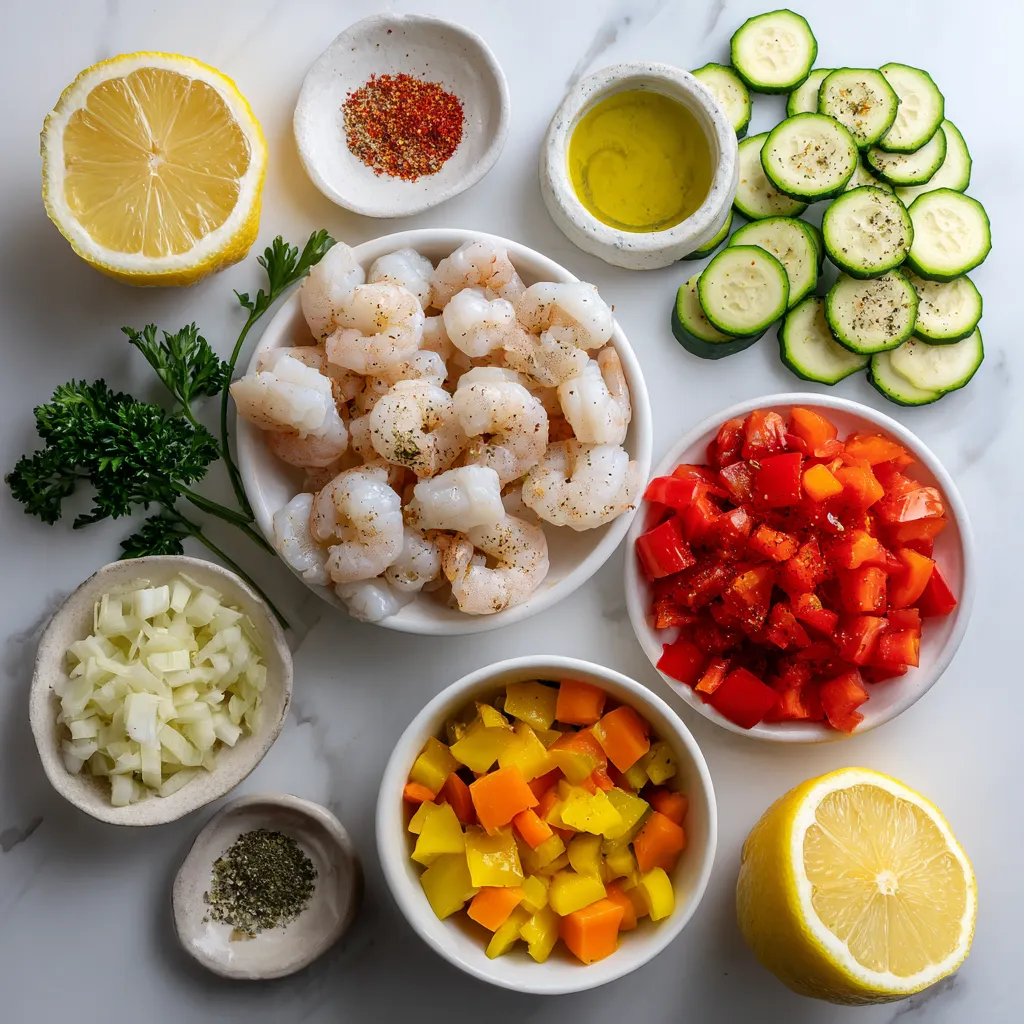 Kirschtomaten bringen Süße und Frische ins Gericht. Jede Farbe der Paprika fügt einen schönen Farbkontrast hinzu. Die Zucchini sorgen für eine zarte Textur. Zusammen bilden sie eine leckere Basis für die Garnelen.