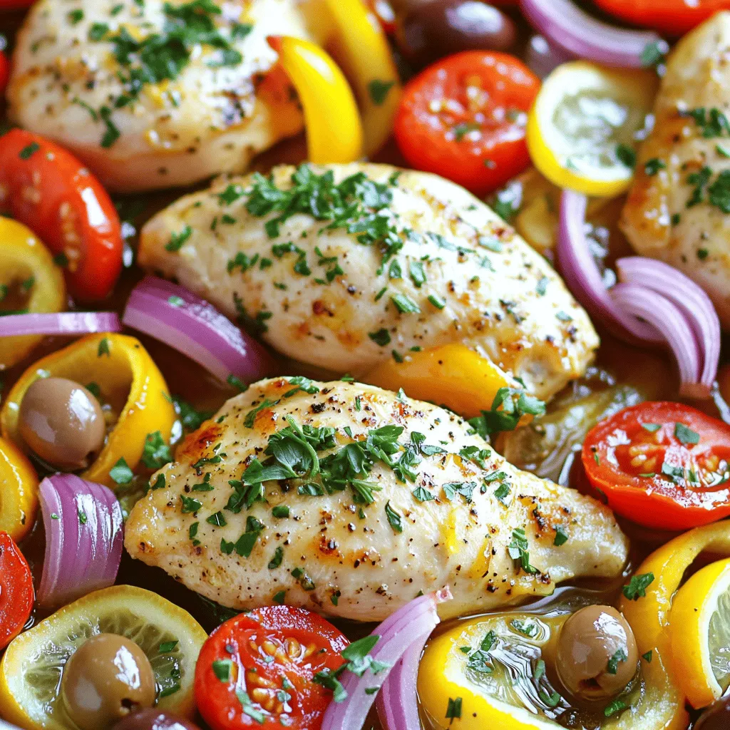 Die Hauptzutaten sind einfach. Hähnchenbrustfilets sind leicht und zart. Paprika bringt Farbe und Süße. Zwiebeln fügen einen schönen Geschmack hinzu. Kirschtomaten sorgen für Frische. Kalamata-Oliven geben einen salzigen Kick.