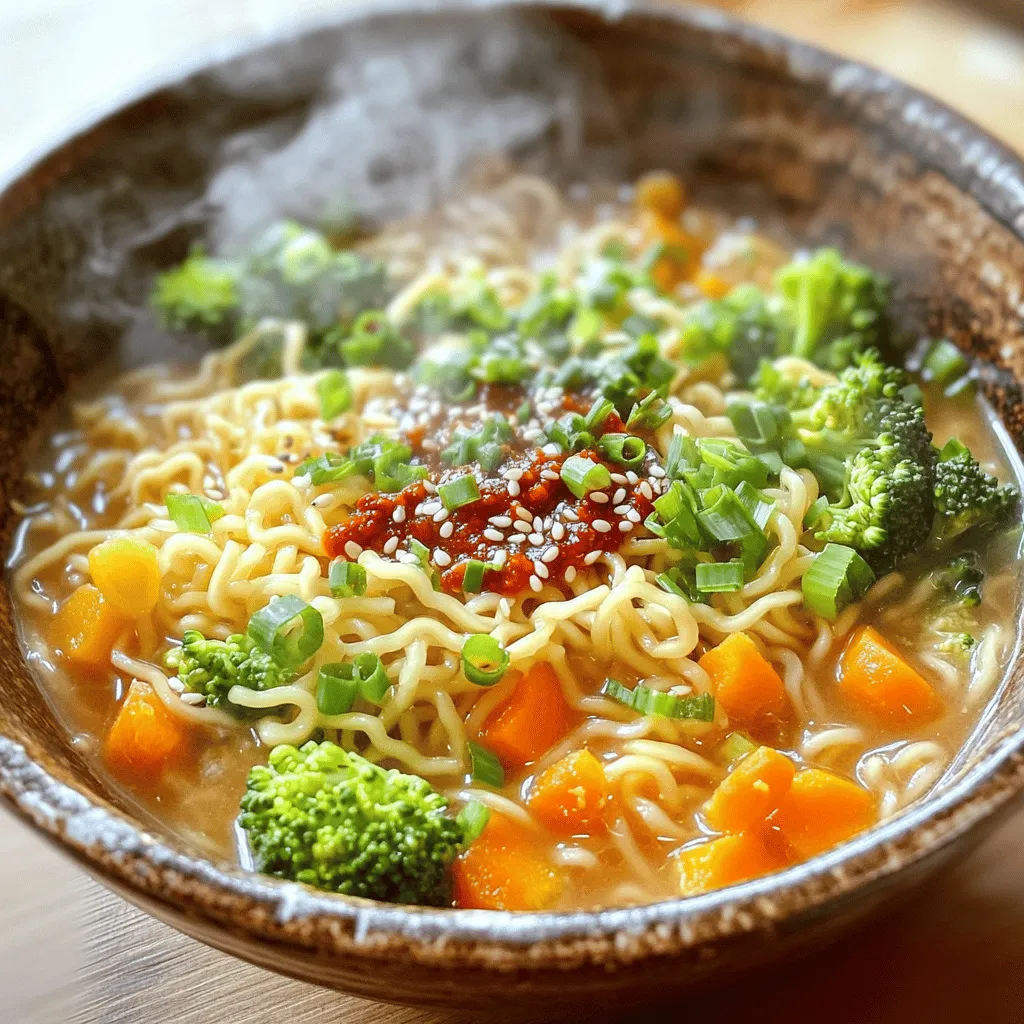 Für eine vegetarische oder vegane Variante der Spicy Garlic Ramen Noodles ersetze die Brühe. Nutze Gemüsebrühe oder ein pflanzliches Bouillonpulver. Du kannst auch die Chilipaste leicht anpassen. Verwende eine rein pflanzliche Paste oder mache deine eigene. Füge mehr Gemüse wie Zucchini oder Spinat hinzu, um die Nährstoffe zu erhöhen. Diese Änderungen machen das Gericht lecker und gesund.