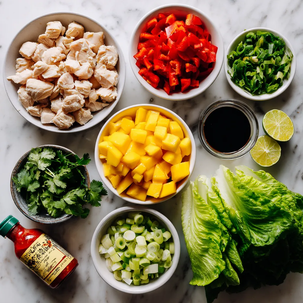 Die Hauptzutaten machen dieses Gericht frisch und lecker. Die Hähnchenbrust bringt Protein und Geschmack. Die reife Mango fügt Süße hinzu, die die Schärfe ausgleicht. Rote Paprika gibt eine knackige Textur. Frühlingszwiebeln bringen einen leichten Zwiebelgeschmack in die Mischung.