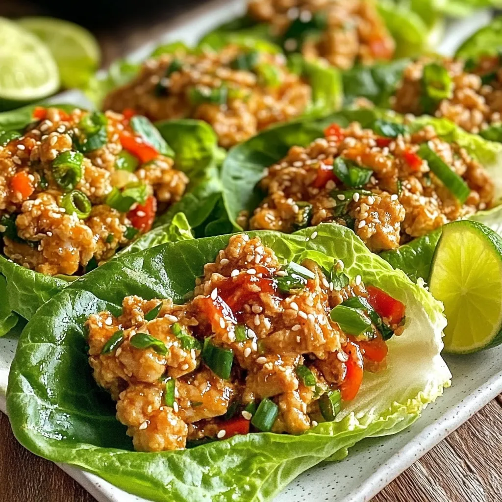 Nehme die Pfanne vom Herd und hebe die geschnittenen Frühlingszwiebeln vorsichtig unter die Mischung. Jetzt kommt der spaßige Teil! Löffle die Hühnchenmischung in die Salatblätter. Falte sie wie ein Wrap. Garniere die Wraps mit Sesamkörnern. Serviere sie mit Limettenscheiben an der Seite. Drücke etwas Limette über die Wraps für extra Frische.
